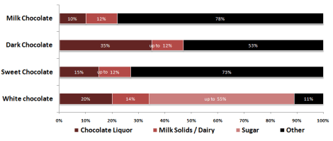 For dark chocolate (which also constitutes the lesser known sweet chocolate), there is a maximum cap on dairy of 12%. This explains why 99% cocoa dark chocolate contains little to no dairy. However, to qualify as commercial dark chocolate without any percentages on it, it must contain a minimum of only 35% chocolate liquor. Once again I find it boggling that more than half of what one is consuming is actually not true to its namesake – chocolate.