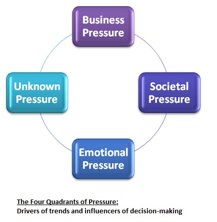 The Mindset Framework, which relies on emotional intelligence and emotional attraction, can explain the target market segments that such distress appeals to. However, distressed denim is more than just an appeal. To better understand the existence of a trend that has permanently cemented itself in the history of fashion, I think it is more appropriate to look at the the four quadrants of pressure which influence decision making.