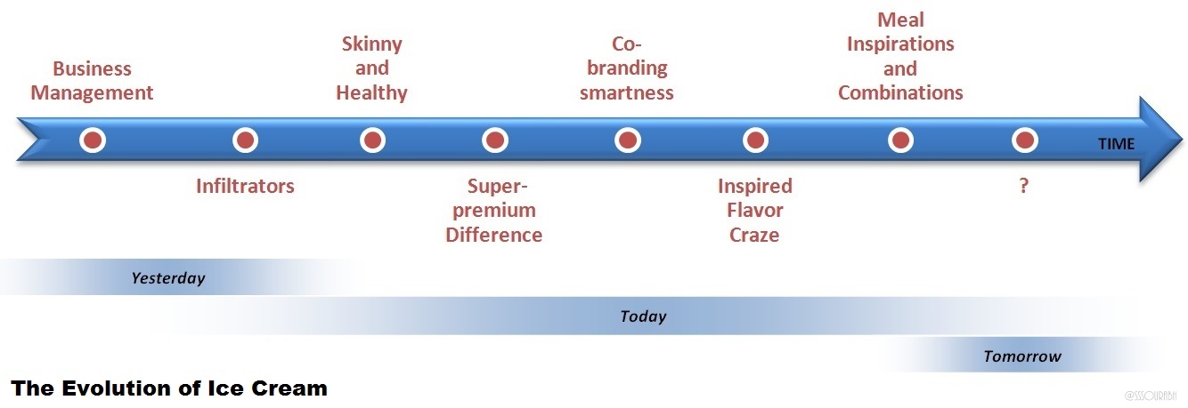 My curiosity about how this happened has led to a mapping of the evolution of ice cream, and what may lie in store! Though the trends are not distinct from each other, with various combinations that give rise to even more diversity, the following figure maps the evolution, trying to grasp the strategy behind each phase.