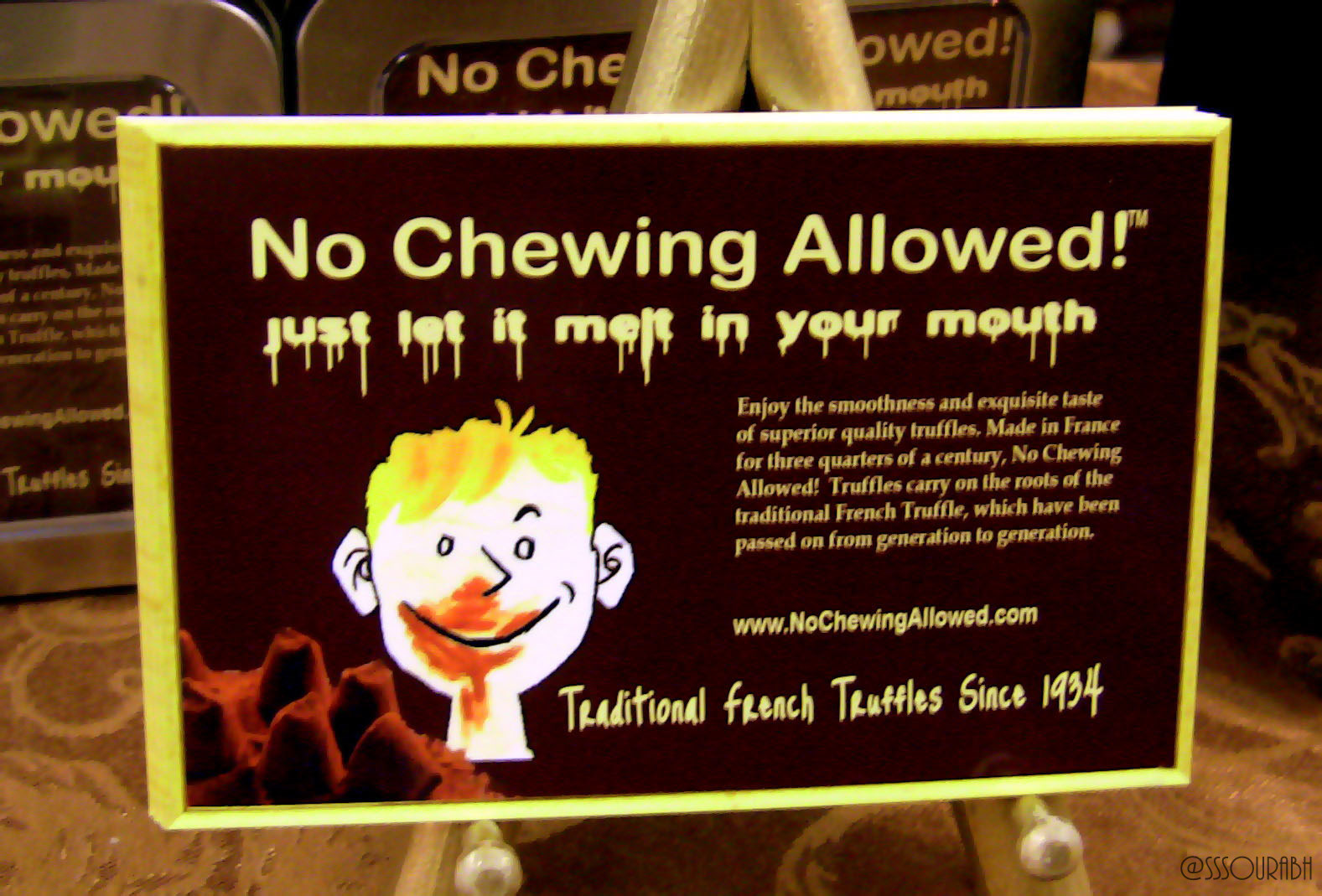 one signature product, I marveled the guts of this brand. When one imagines truffles, images of decadence, magnified mountains of smooth, tender chocolate dusted with cocoa sand with velvety images in a mushy ambiance all come to mind. And here, No Chewing Allowed broke all stereotypes to come up with a naughty, refreshing story; a child’s face with his mouth smothered in chocolate! It truly persuaded one to be a kid again, to fundamentally enjoy the truffles instead of treating them like a showpiece, and yet retaining the aspect of savoring what you eat by banning the use of teeth. The result? Pure chocolate that melted in the mouth for ooh-evoking reactions living up to the juxtaposed tagline of traditional French truffles. This one won the vote for wit.