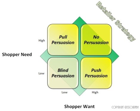Pull  persuasion: For the almost emotionless requirement, the consumers are likely to pull the products towards them due to the inevitable need for the purchase. It is not necessary to elevate this need to a want, or to cater to the emotional aspect too much. This is where retailers can utilize the pull strategy to create singular deals. As this is a requirement, no extra effort is needed from a retailer perspective to engage interest, although some knowledge delivery is necessary. Weekly discounts at stores like Home Depot or IKEA fulfill this quadrant; consumers there are most likely buying requirement items, pulling these towards themselves, and singular deals can elevate the purchase volume.