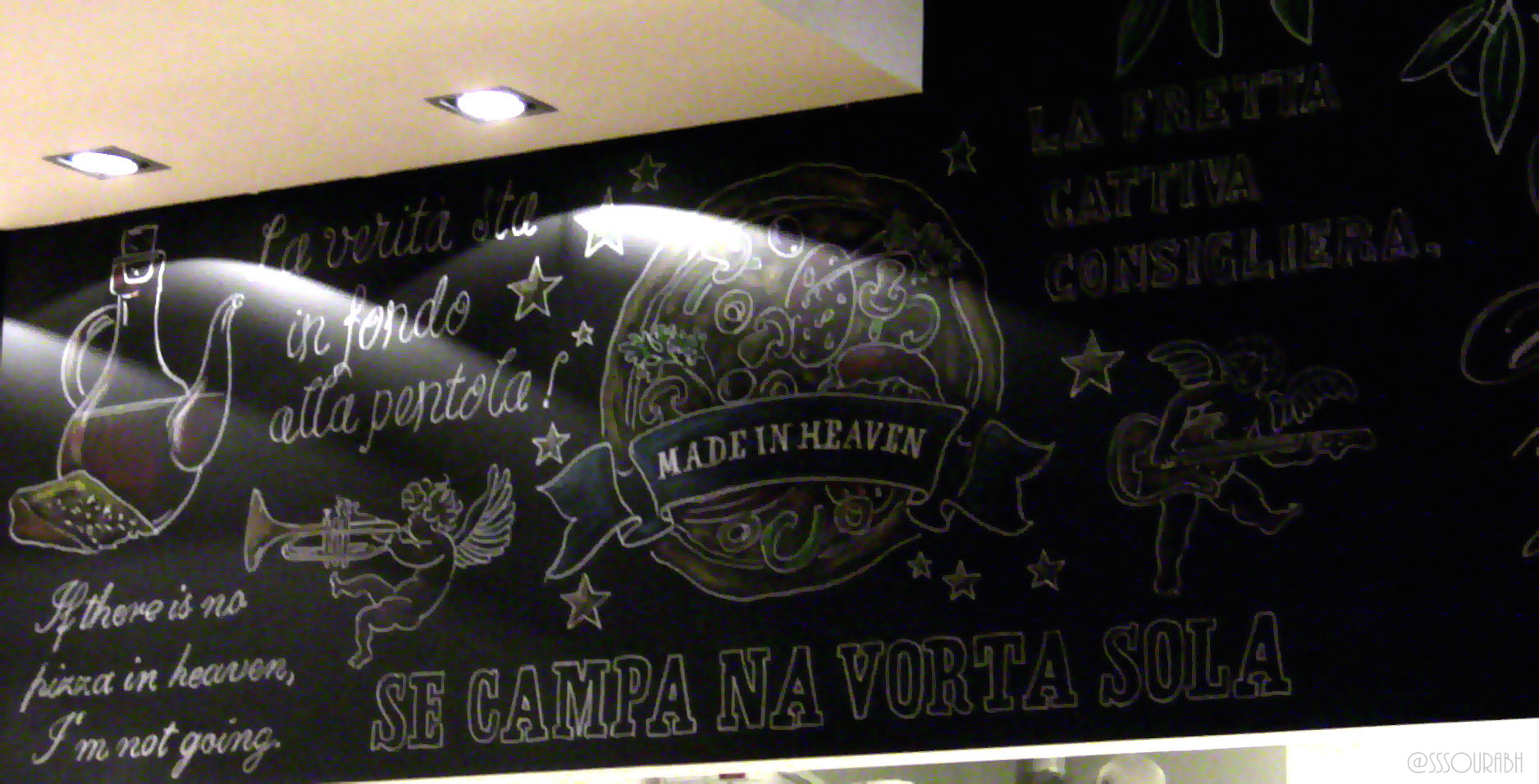 The doughs are blended in a routine dancing fashion by enthusiastic bakers, all working behind huge glass panels for easy visibility and for appetite inducing line waits. Above the kitchen areas sits a blackboard with kid-like drawings and witty lines to charm waiters and convey the casualness in service. The juxtaposition with the gleaming floors and red vials is intentional, and works.
