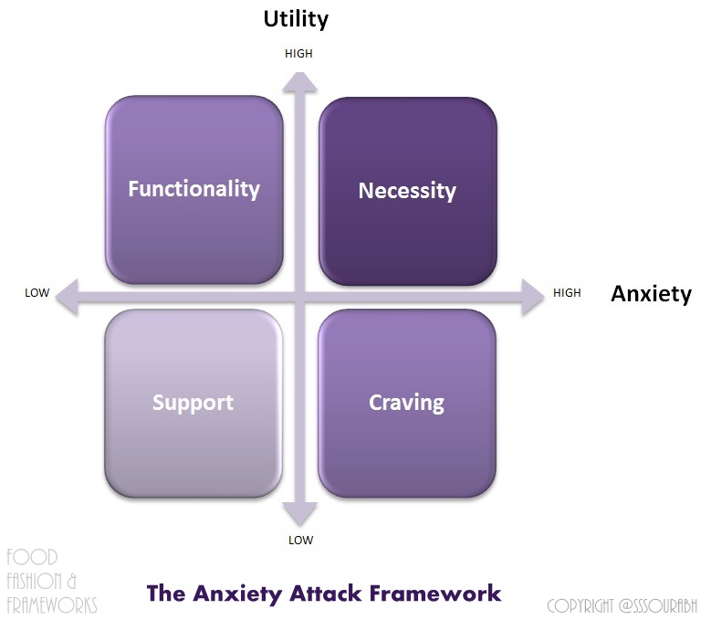 This gives rise to the Anxiety Framework, whose parameters and quadrants need not be confused with the Shopper Psychology framework. Utility describes the usefulness of something that we desire – a movie, a product, or anything. Anxiety is the level to which we want it (where notice that the want can be created, as in aforementioned examples).