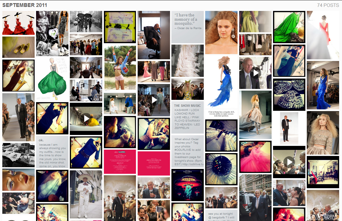Oscar de la Renta jumped on the bandwagon this year, following up from the fragrancing campaign, with a rather inventive idea. The designer created a live generating kaleidoscope of all content hash-tagged with #odlrlive premiering as live coverage. Not discriminating on source, this comprised of photos, videos, tweets and texts from editors to bloggers to models (who also tweet before walking the ramp!). Meriting from a first-mover honor on Tumblr, this was a distinguished and buzz generating livestream (which however, Tumblr had to monitor with scrutiny for spam – the s-worded pitfall of social media).