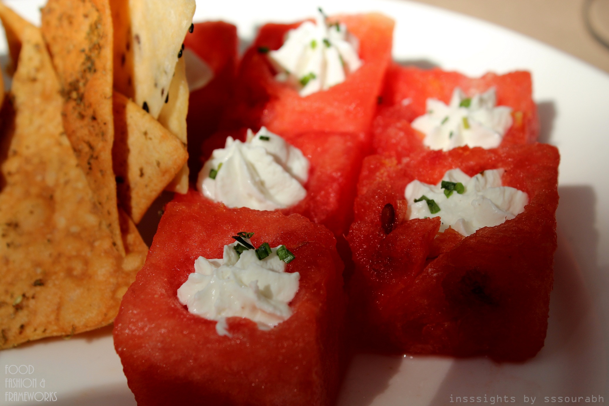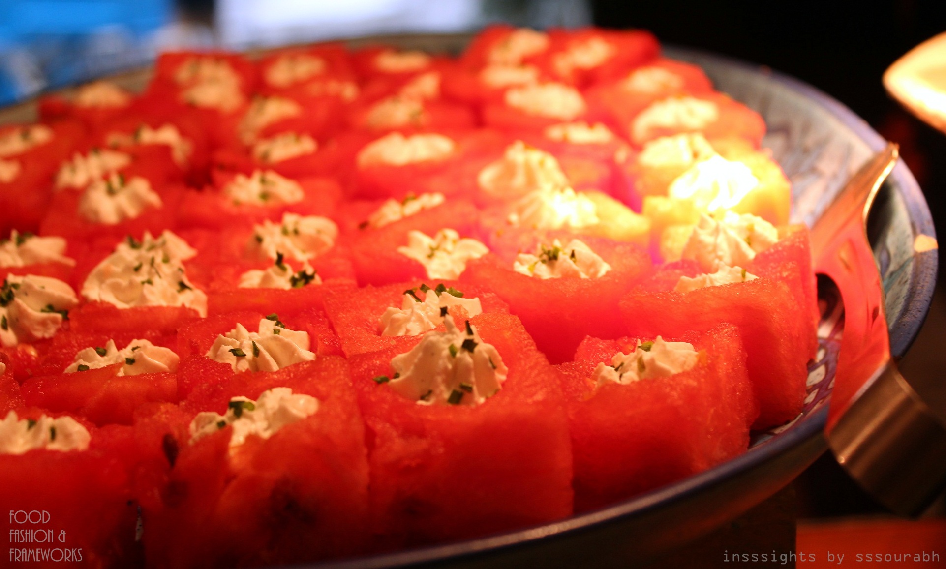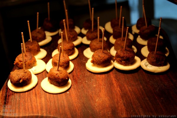 I was floored by the watermelon cubes with a teaspoon scooped out and stuffed with feta cream cheese in a frosting pout shape, kissed with mint leaves. The oxymoronic sounding taste was a flirtatious infatuation of tastes and textures – the crunchy watermelon dripping with flavor and the creamy feta with its distinct aroma. This affair mandated umpteen helpings.