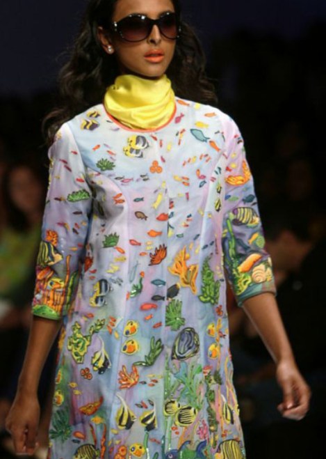 Designer Gayatri takes from the filmy scenario of being caught in the shower by a certain someone. While nothing immediately futuresque, inventive, or zappy about this, its still quite a creative flair on the situation. So why not turn a shower curtain into a dress? While not plummeting down a line of fantasy with translucent peeks, it falls into a classy, conservative style outfit which looks functional for an outdoorsy rendezvous.