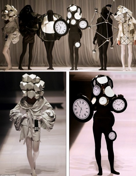 Amongst the many things I am known for, one of them is never being on time. Yet, would I choose a clock attire over the watches in my dresser? Beijing designers, one of whose close buddies pointed me in the direction of these fascinating works of art, have embedded clocks as a centerpiece in their eye-catching runway collections. Ironically, these prevent the the models from using their eyes. Using monochromatic hues of black and white alone casts a glossy look on beholders’ eyes, who instinctively checksto see what time zone they are perched in.