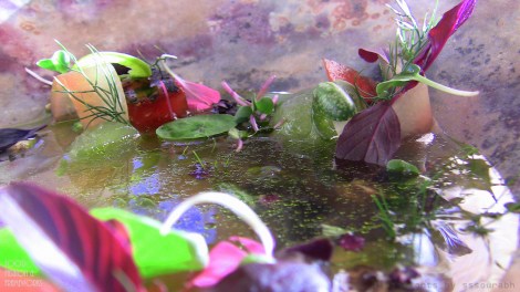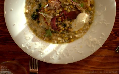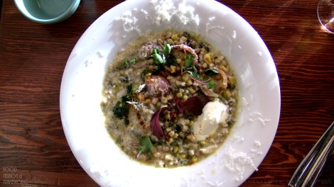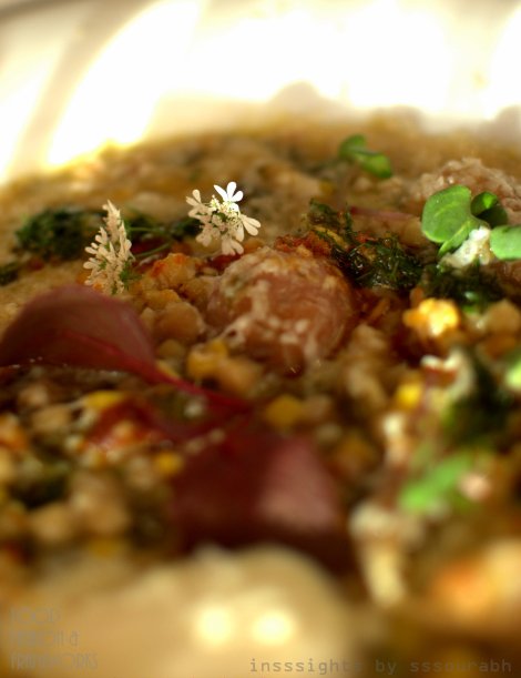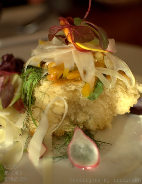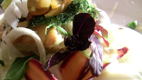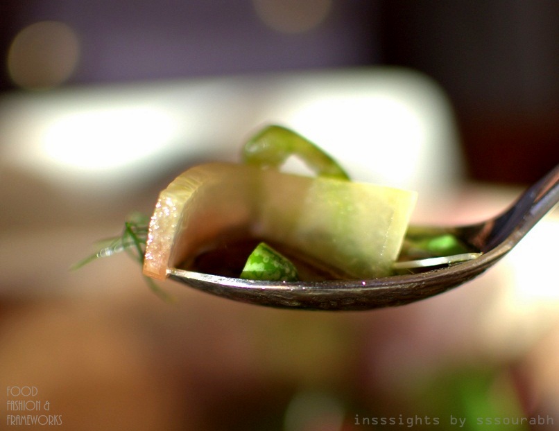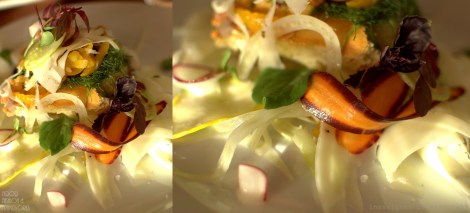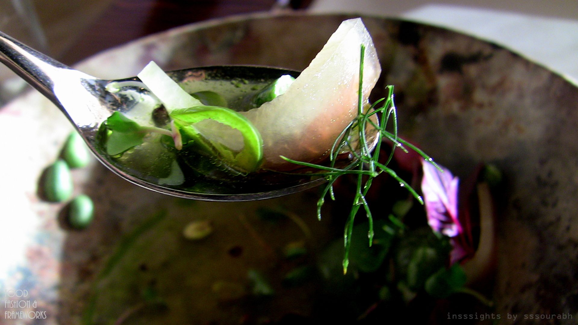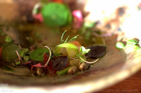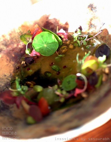 The appetizer was a soup of lake-like proportions, since it visually resembled an ethereal pool of coral and water, dressed with apt green finery, described as a dressing of greens, leaves, flowers, roots and herbs. The water base was an emulsion of vegetable flavors, starch and olive and truffle oils, some of which glazed in the light on the surface, making the entire dish look somewhat opulent. The heavy stoneware bowl-plate enhanced the earthy décor, accentuated by purple leaves and beet bits. A large lime slice added the right acidity, while a scoop of roasted peanuts gave the desirable crunch factor, while the aromatic flavor had a source in the forest of rosemary that had been dipped on the circumference of this well of delight. And my favorite bits were the miniature seedy vegetables that looked like watermelons in texture, but tasted like cucumbers! Pasted on the platter like dainty gapers, they added to the visual delight.