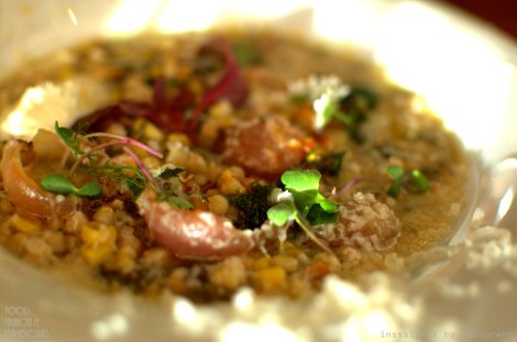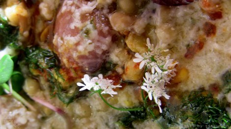 Our solids arrived to break the liquid day with a succulent surprise. As if paying homage to my out-of-hand observations favoring all things in disguise, the corn platter was actually petite spheres of pasta, doused in a creamy peppery sauce and spinach. The textures were broken by boiled potatoes sans salt, which gave the plate a profound, pure taste, especially when supplemented with goat’s milk whey and a tasty parmesan and mozzarella cheese blend, grated so finely that they added ironic depth to the shallow, simple plate. Garnished with white florets, with tendrils of dry cheesy wasps on the plate rim, the entire dish told a story of a romantic, mysterious getaway, where pasta was the corn imposter in a gypsy-like circus of tasty flavors and flamboyant colors.