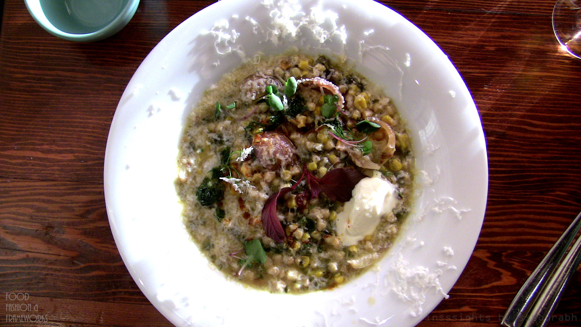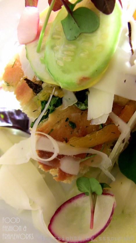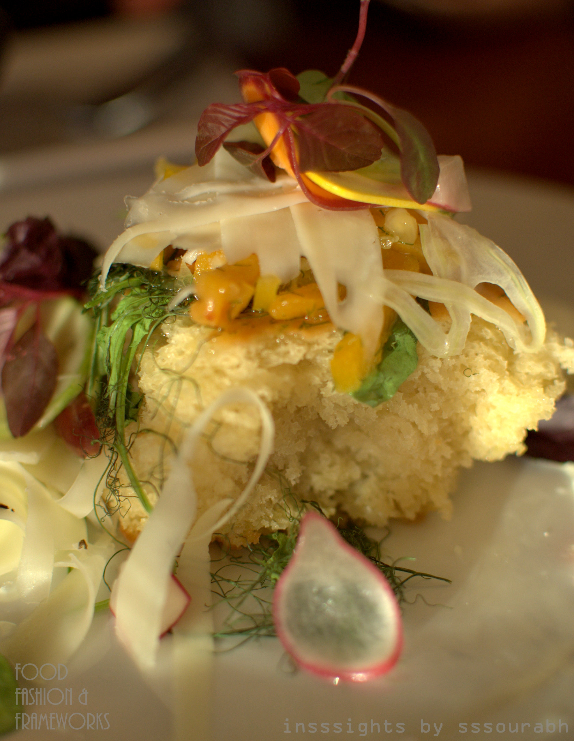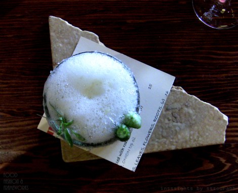 The restaurant boasts of high culinary pedigree, where Chef Aaron London’s gastronomic spectacle is tasty and more importantly, visually addictive. Located in a restored building, its construction and rustic flair give a rustic welcome. Despite a long wooden dining table as the focal center point, we chose to sit by the long windows, where the blinds cast sliced light onto stonely textured walls with ethnic paintings in abstract colors. There was an open kitchen at the back, with what the waiter mentioned as a yoga studio upstairs. Our meal comprised of multiple courses, infused with textures, colors and an orchestra of tastes and visuals.