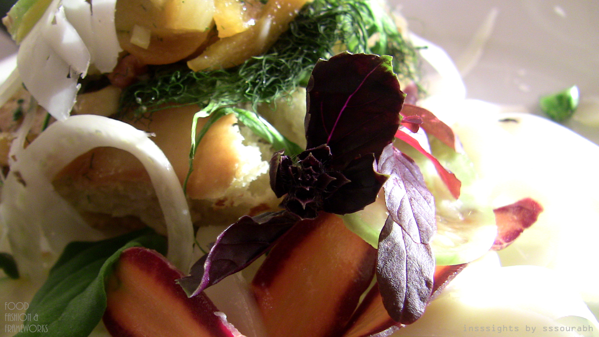 As if this gastronomic fest wasn’t enough, our next entrée arrived looking even more vibrant and textural than the previous. Layered atop a buttery turmeric hued slice of bread was a heap of sweet onions, cucumber, greens, radish and gorgeous purple glazed carrots. These in particular caught my fancy, as carrots fall into my line of obsession, not far from my confessed love of pomegranate and curry. Lightly glazed and sliced thinly, their edges were a royal purple that exuded carrot flavor in a distinguished attire. These played tag with similarly hued radishes, complemented by a plethora of fresh greens. Although a tad too buttery, the open faced sandwich concept was saturated with enough crunchy bits to give the entrée round a palatable finale.