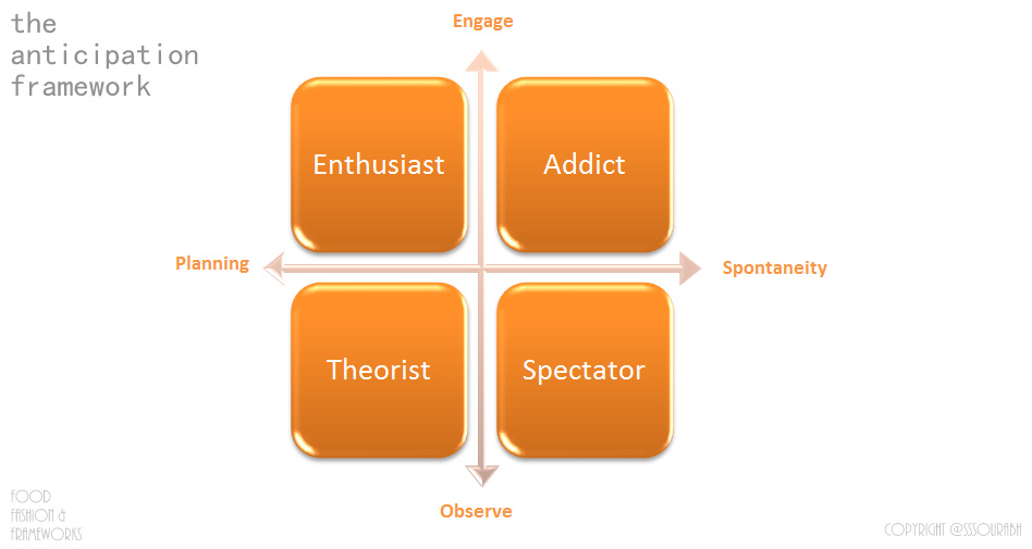 My addiction to personality deductions from two by two matrices quickly ignited the anticipation framework that groups people between planners and spontaneity seekers, and those who engage or observe in the activities they are about to embrace. It fits with any upcoming event really, but works best with Fashion Week, and even better with Fashion’s Night Out.