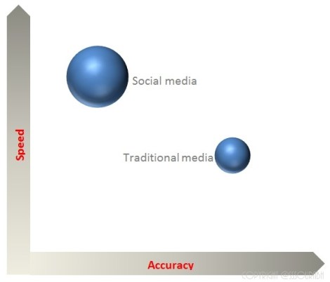 A pictorial of the accuracy of news versus its speed shows that social sways more on the speed side, while traditional more on the accuracy. Naturally social can be split into twitter handles and tweets of corporates and emergency hotlines that are more real-time, reachable, and thus accurate. And traditional media encompasses news channels, who also have their own social feeds, making the lines blurry. But what is most evident is that the volume of the former overrides the latter (volume being the size of the bubble in the following figure). Is this a threat or a forecast of our impatient digestive tracts?