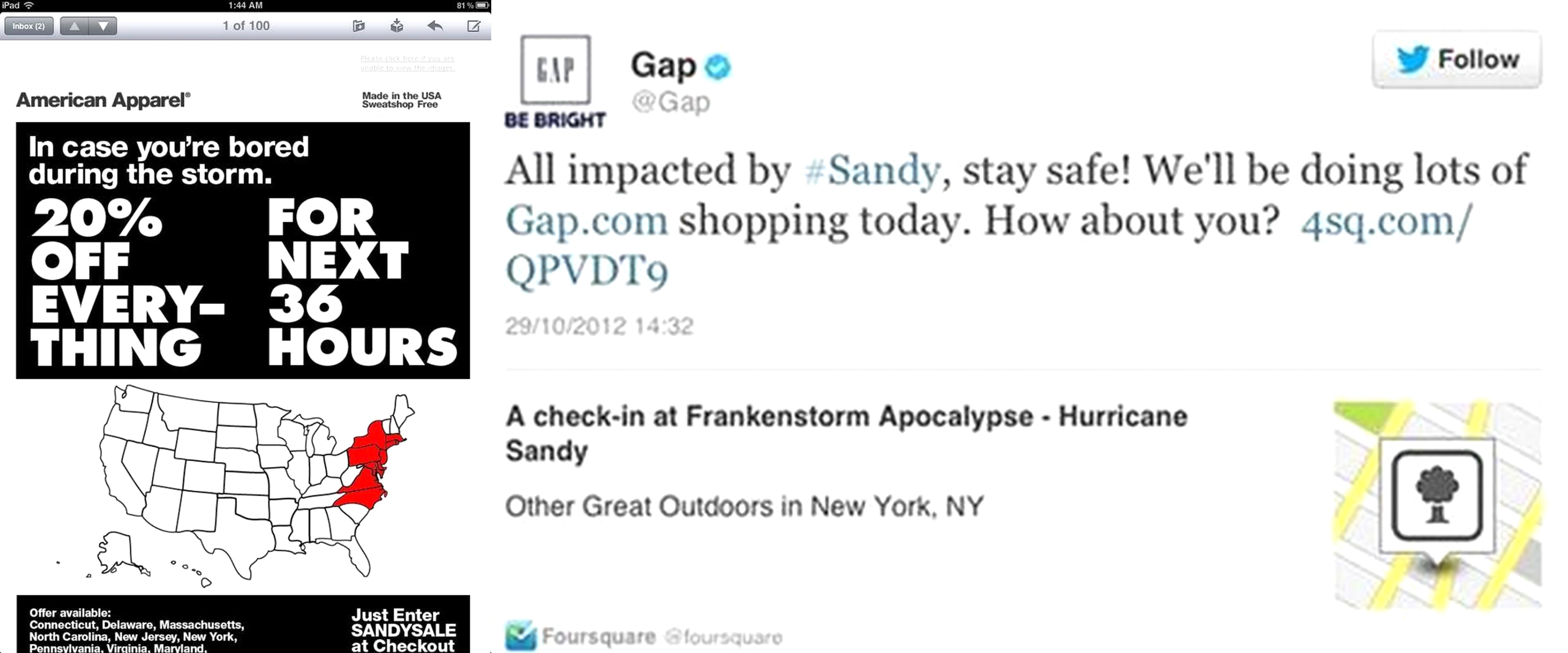Now rumors are one thing, but abominable PR acts by retailers trying to practice solid social media marketing by using Sandy as a means to sell oddball goodies simply fall off the grid. Most notably American Apparel, seconded by the likes of Gap.com’s indirect and misinterpreted urge to stay indoors, alongside UrbanOutfitter’s free shipping offer, ignoring the point that USPS may not be operable in this time frame. Talk about companies that will soon be hiring social media experts!