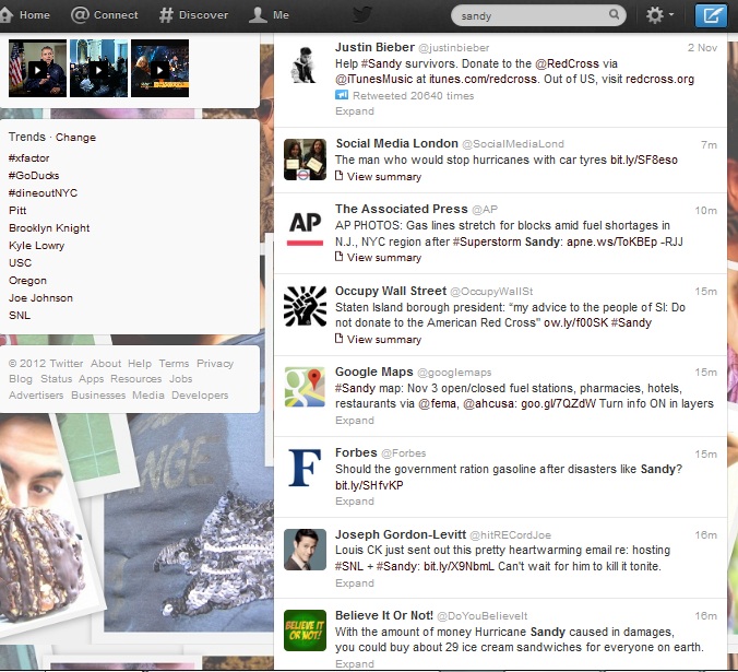 Despite these blemishes, there were several success stories of trapped individuals tweeting for help given that traditional 911 lines were dramatically backed up, or optimistic tales of influencers hashtagging and reaching out for help to save power-deprived patients that needed tremendous, instant aid. Twitter indeed became a real-time hotline and worked for many. News reporters continue to observantly scrolling through tweets or at the very least acknowledge their presence, making social a means to influence, not ignore. Even after the event, aid efforts pour in, and debates continue to evoke thoughts through on a dynamically alive twitter fed for #Sandy.
