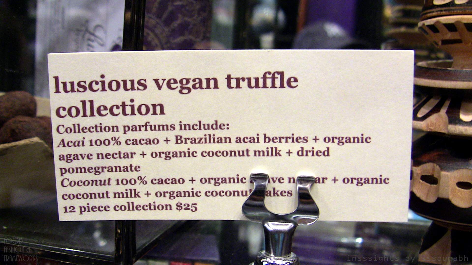 Naga was a milk chocolate truffle sprinkled with sweet Indian curry powder and infused with coconut. This curry dusted splendor was by far most superior, for the tastes melted graciously together on the palette. With a penchant for adulterous flavors of chocolate, I wanted to like the Balsamico, where dark chocolate flirted with 12 year aged balsamic vinegar and Sicilian hazelnuts. But while the texture was crunchy owing to the latter, the former barely made it through, as I was left yearning for more of a kick between my chocolate teeth.