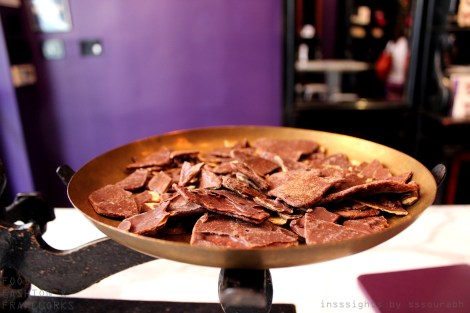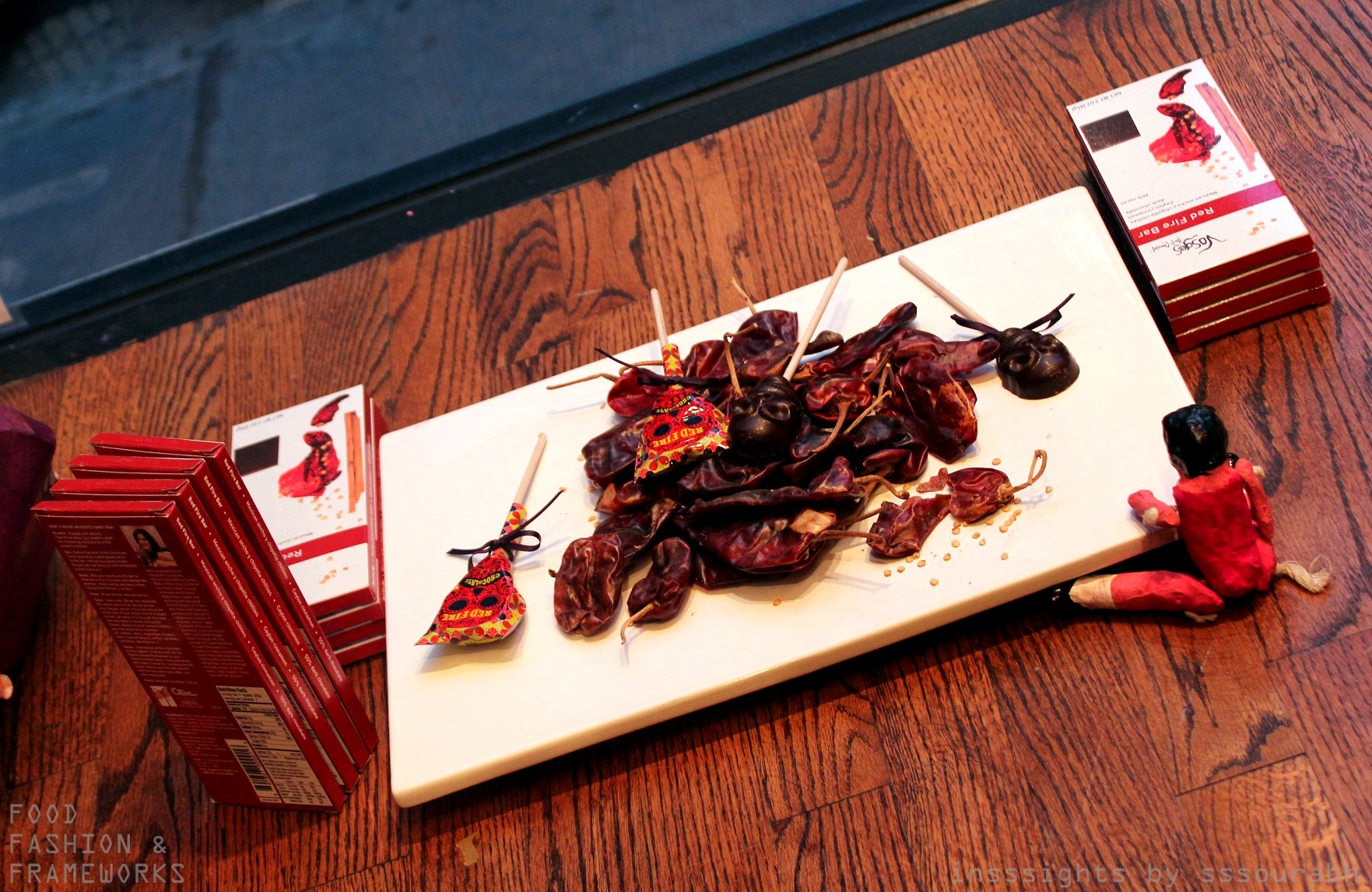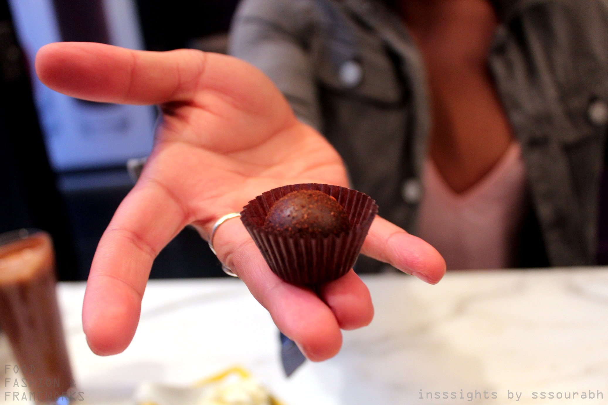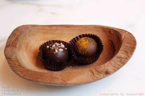 While waiting under gigantic chandeliers that clinked in the still air, a visual wander showed that Vosges had much character. Lolly candies dressed up as skulls made frequent cameos, the most photogenic one being on the bay window, with the fiery red chocolate bars gaping at the ashes of dried red chilies that were reminiscent of ghost chilies. We waited in the enchanting, eerie atmosphere for our chocolate truffles to arrive.