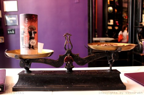 A bar table centerpiece was ironically a vintage weighing balance with chocolate bars on one side and sampling crunchables on the other. It was no wonder that the flaky, chocolaty, snack sized morsels were consumed on the side closer to us, thereby tilting the balance in a way that spelled embarrassment.