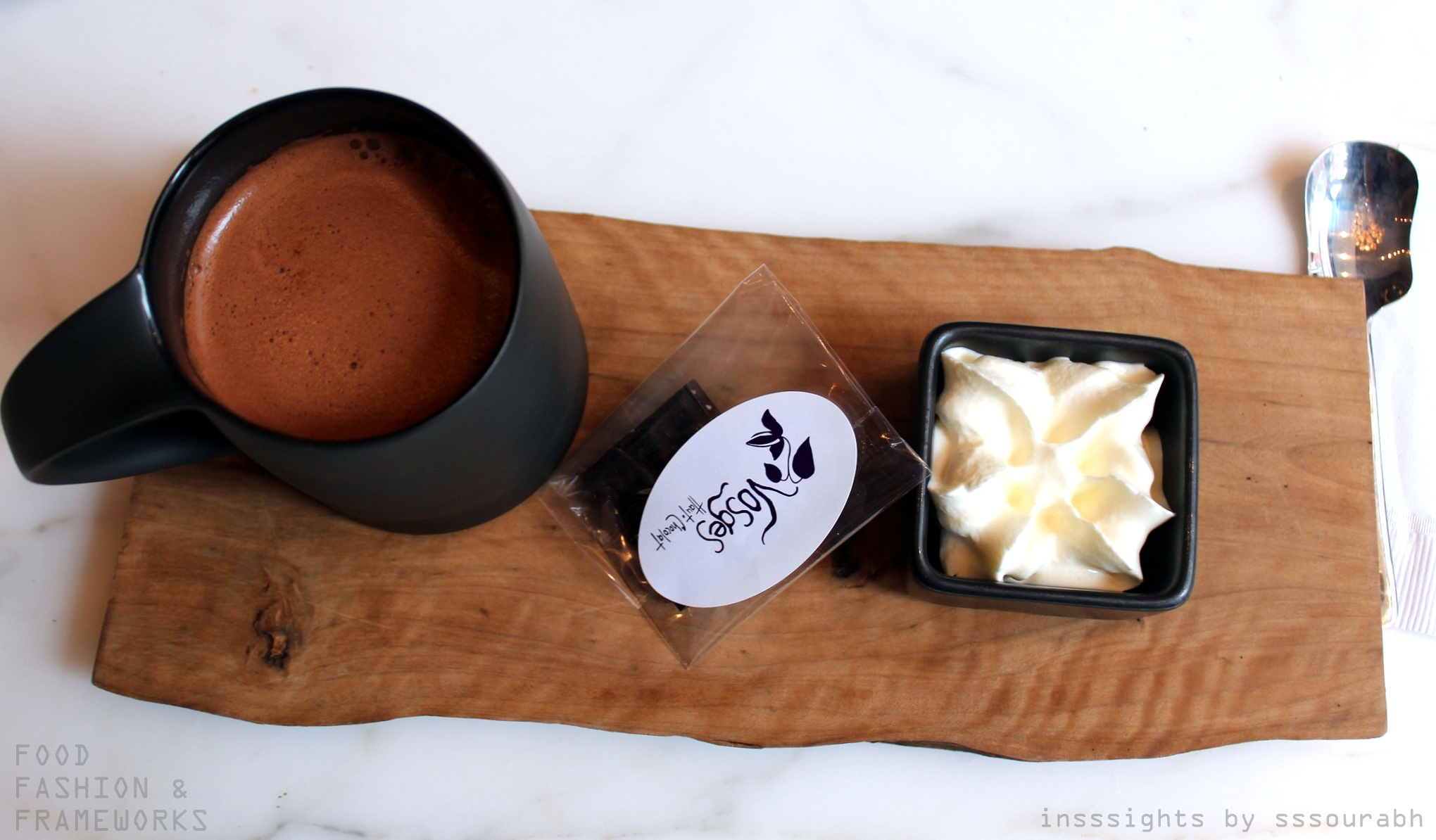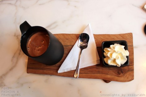 An interlude of beverages was much desired, and despite my incessant milk craving, I substituted it with coy concoctions on the menu. The chili hot chocolate arrived on a wooden plank with a dollop of whipped cream that I happily avoided, and a crunchy dark chocolate wafer that I gladly devoured. The hot chocolate itself was thick and lacked sweetness, much to my palatable pleasure. Aromatic with cinnamon undertones, the chocolaty warmth left a bittersweet taste on my tongue, which further encaged my abdomen as I swallowed.