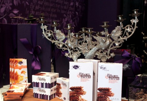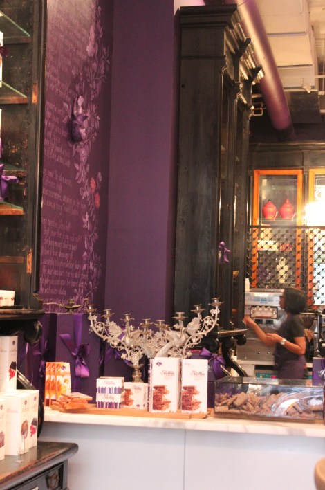 Which is why I let a sigh of relief when my colleagues introduced me to a boutique little store sans lines and crowds. Vosges chocolate boutique has a few locations sprinkled in cosmopolitans, but the Soho New York boutique is one of the finest. It has an enchanting and rather dark ambiance, dipped in regal purple with walls of textured poetry and doves and chocolate mixes and bars.