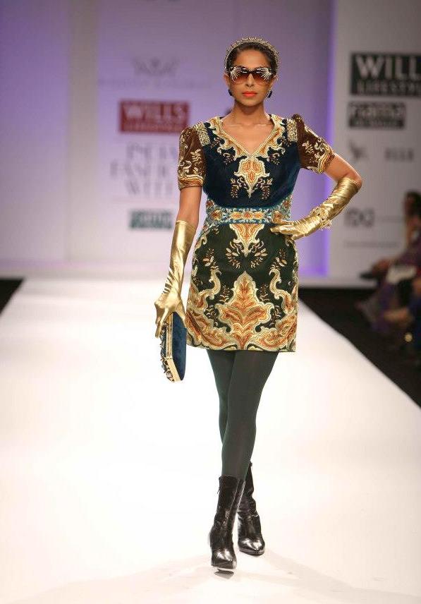 Pumping up the heat a notch with a fetish for boots and accessories was the funky exotic collection by Rajdeep Ranawat. Imagine everything Texan and medieval Europe, but with heavy Indian craft infused onto every layer. He had everything from royal crowns to court style garments, all lavishly decked up in textural fantasy. Best of all were the boots, especially in non-black and non-grey hues of maroon and turquoise, often lined with Swarovski and spiky metal. Kaftans, skirts and baggy shirts were all crafted with sheer georgettes and silks in a rainbow of hues like earthy browns, night sky purples and grassy greens, all with enough peekaboo to evoke mischief whilst retaining the splendor with curvaceous prints and embroidered accents. The dress and leggings concept was amplified with splendid artwork, and even a boring sheer shirt with trousers look for corporate was turned into a festive color block that the likes of Tim Burton would be proud of. Ditto for the leggings and flats look amped up with neon leggings, metal speckled cluthch bags, contrasting belts and tangled chains suspended from solid shoulder pads. Mainstays like the sari or lehnga were made timeless by combining velvets with sheer in bold colors combinations like maroon and black or turquoise and beige, all with full sleeves of embroidery and flare, and high necked bodices which were also encrusted with gold finery. And those who weren’t dazzled enough already could easily salivate over the trending luxe cuffs, the blingy crowns, the metal infused hatpins, or the gold leather gloves!