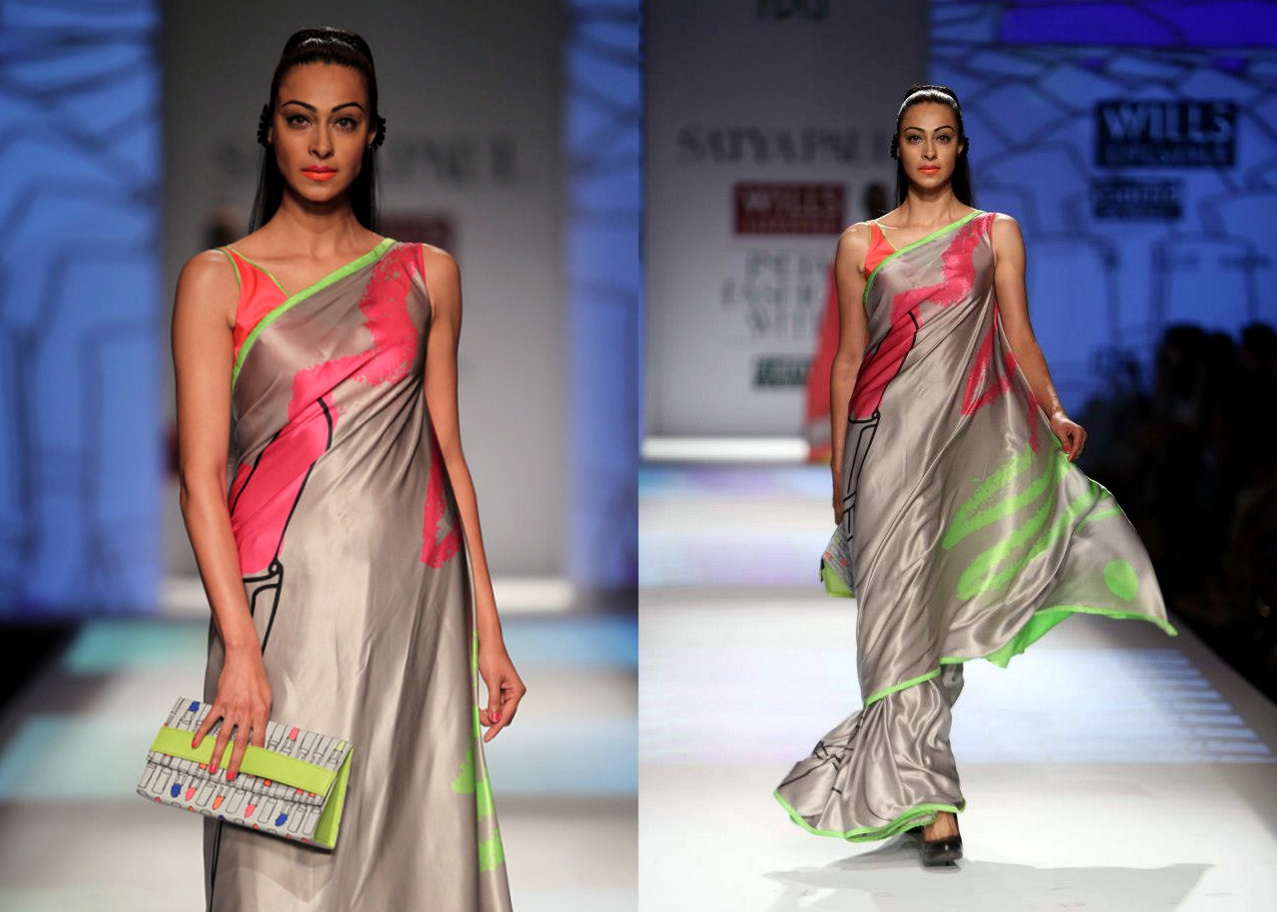 of the season. Having salivated over her tribal cow print blazers in retail outlets, this one was a feast for the creative eyeballs with designs that spelled quirky. Breaking away from a classical sari design of border and pallav and symeetry, she instead treated the fabric like any other art canvas and unleashed her imagination on it. Oversized lipsticks were splashed alongside their seductive swiveled smudges in animated black outlines on dresses and saris, exuding a modern and contemporary swagger. My favorite pieces were a gigantic pink one on a grey silken sari with pastel green graffiti-like swirls, and a contrasting extension sari design in grey and coral as well as black, neon green and coral. The models strutted with innovative drapes that redefined any pre-existing norms, stretching opportunistically to divulge the exaggerated lipstick print, which made for an alluring and pleasantly distracting facet. On closer look, the abstract prints were shimmering with sequins and embellishment, which was short of gaudy courtesy of a tone-on-tone strategy. On kaftans, the lipstick print married the yesteryear Middle Eastern grace with modern day funk. I was less of a fan of the English telephone boxes in newspaper hues splashed on bustiers with dead black skirts akin to a modern lehnga, but having the print on boxy luggage will definitely add to my frequent traveler collection.