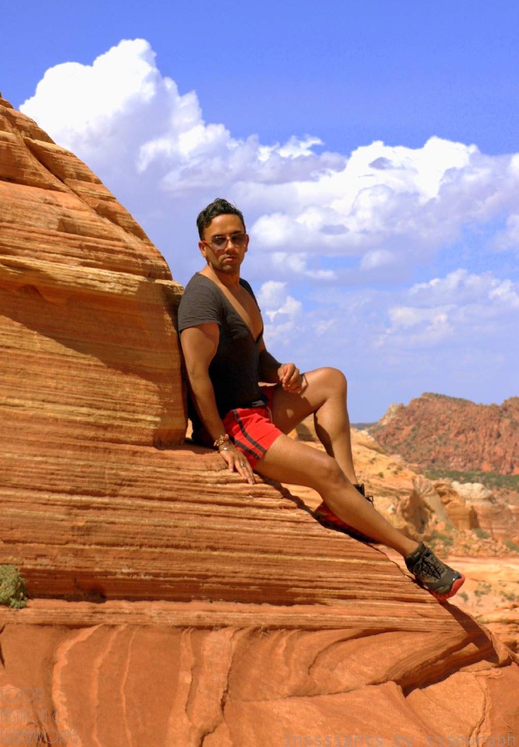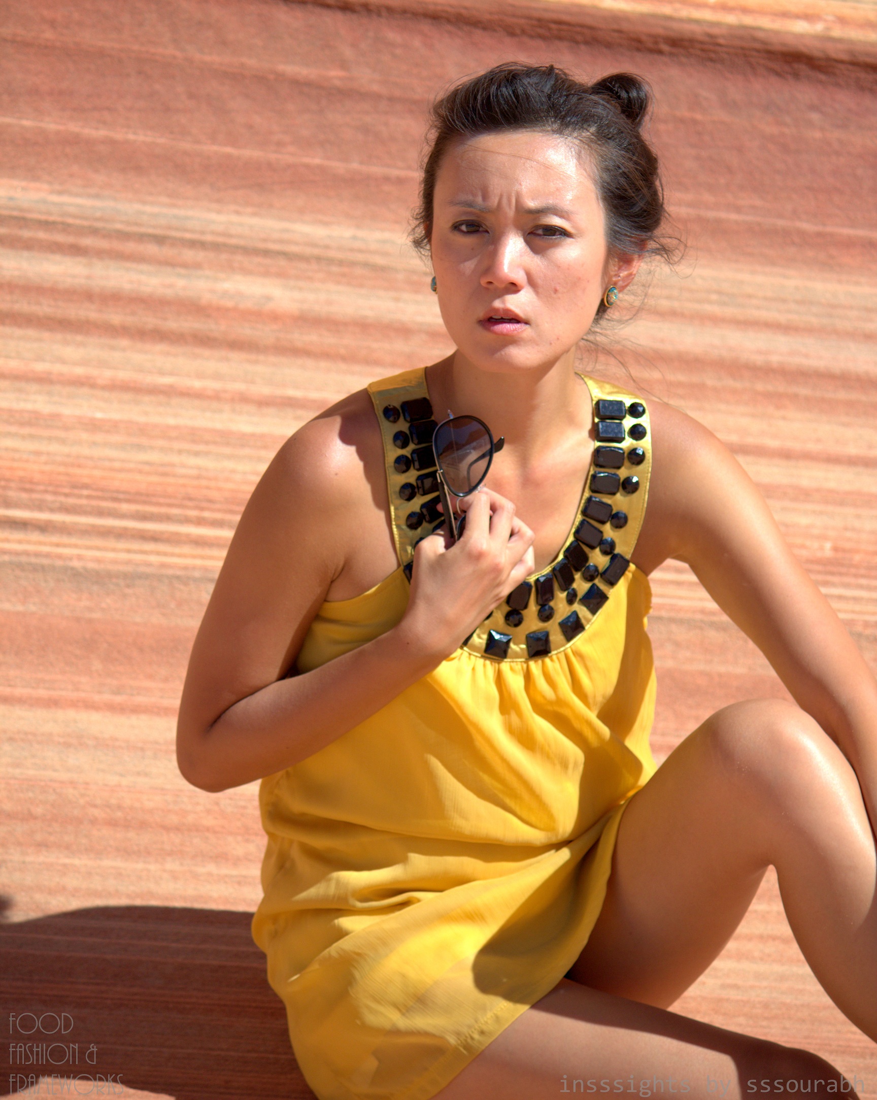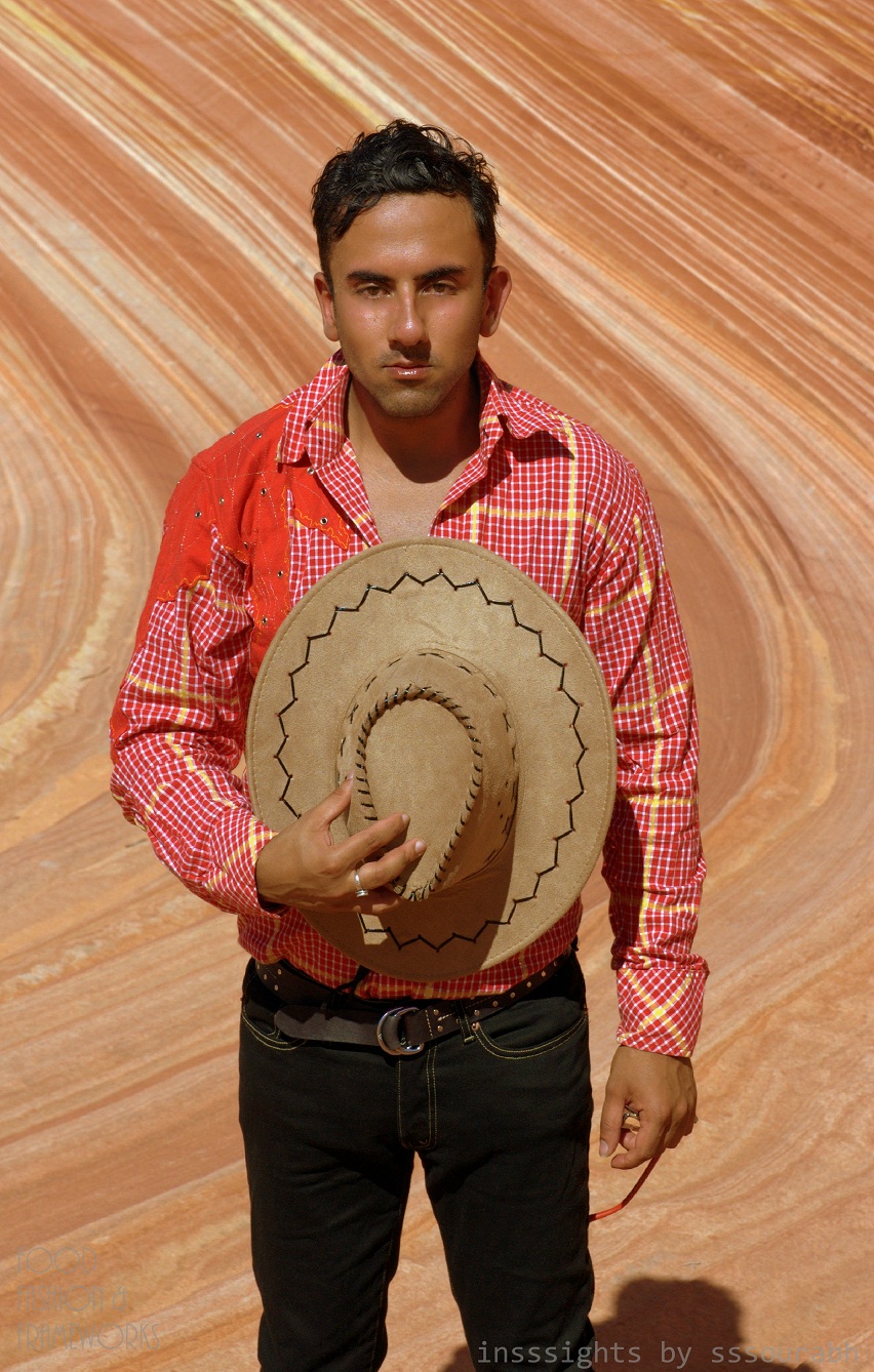 After lengthy and long sunrise circling drives that looped around identical mountains, we came to a dirt road that constituted of dried up streams like a dry octopus’s evil tentatcles, ready to strangle at the wince of a muscle. This physical hike came next, through jagged cliffs, cactus stitched grounds and swarms of quicksand, with faces in the rocks peering at us as we strolled passed them, with an eerie feeling of being watched under the sun’s vile gaze. We were guided by an ironic series of photographic watch points, which spelled ambiguity when combined with our intuition and a rapidly languishing bucket of drinking water. The practice shots, backstage if you like, were impactful and exemplary of our subsequent photo shoot, albeit sans the surface glam.