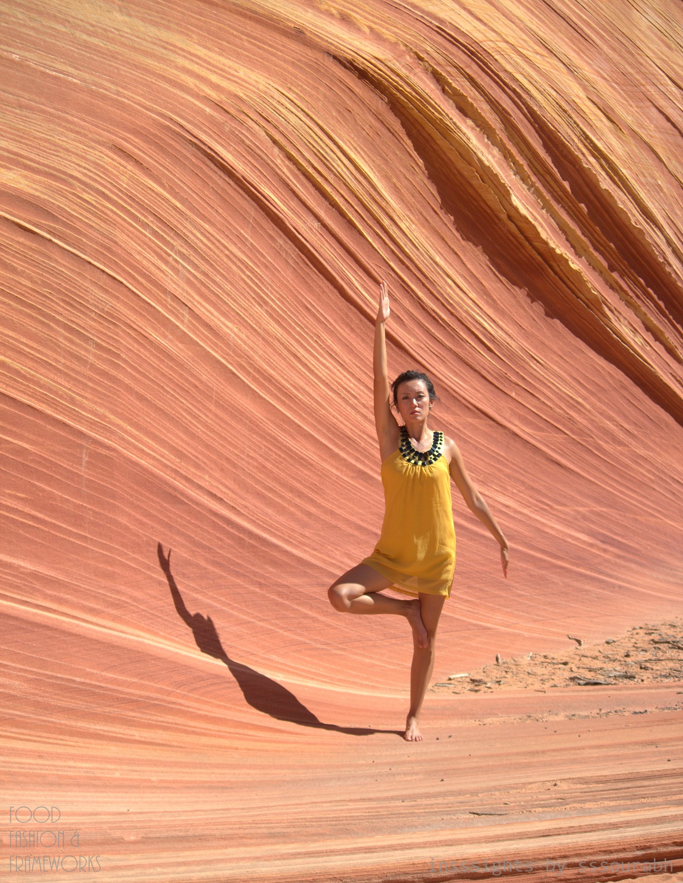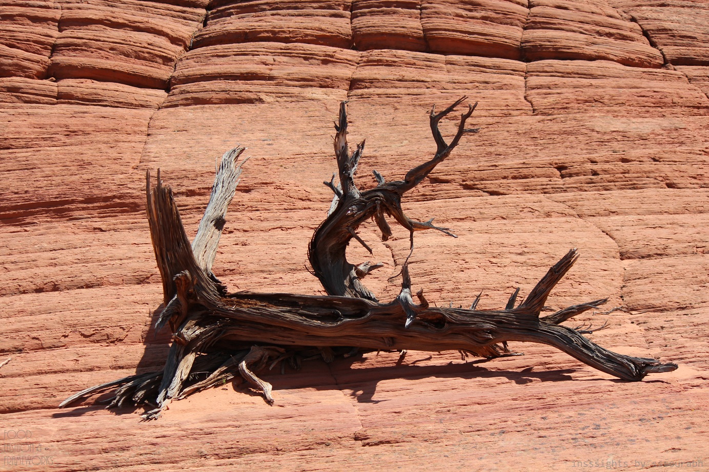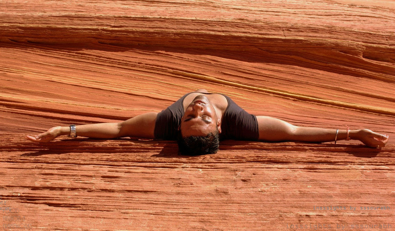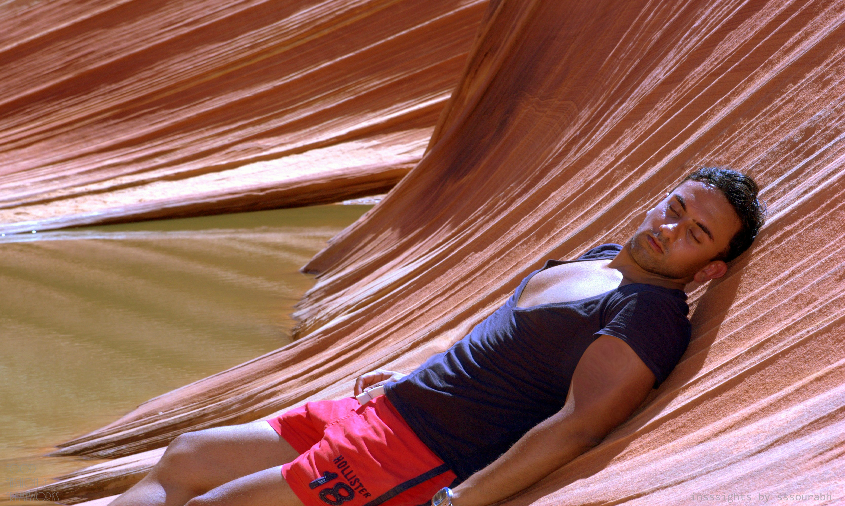 The Wave was a surreal texture of horizontal hues of desert red, sunset orange, fiery white and suntan bronze. With death gnawed twigs and branches at its feet, the lush blue water was a mirage that captivated out lenses and imagination. Aside from the curvaceous linearity of the Wave’s natural construction, the water body became a focal point of our work.