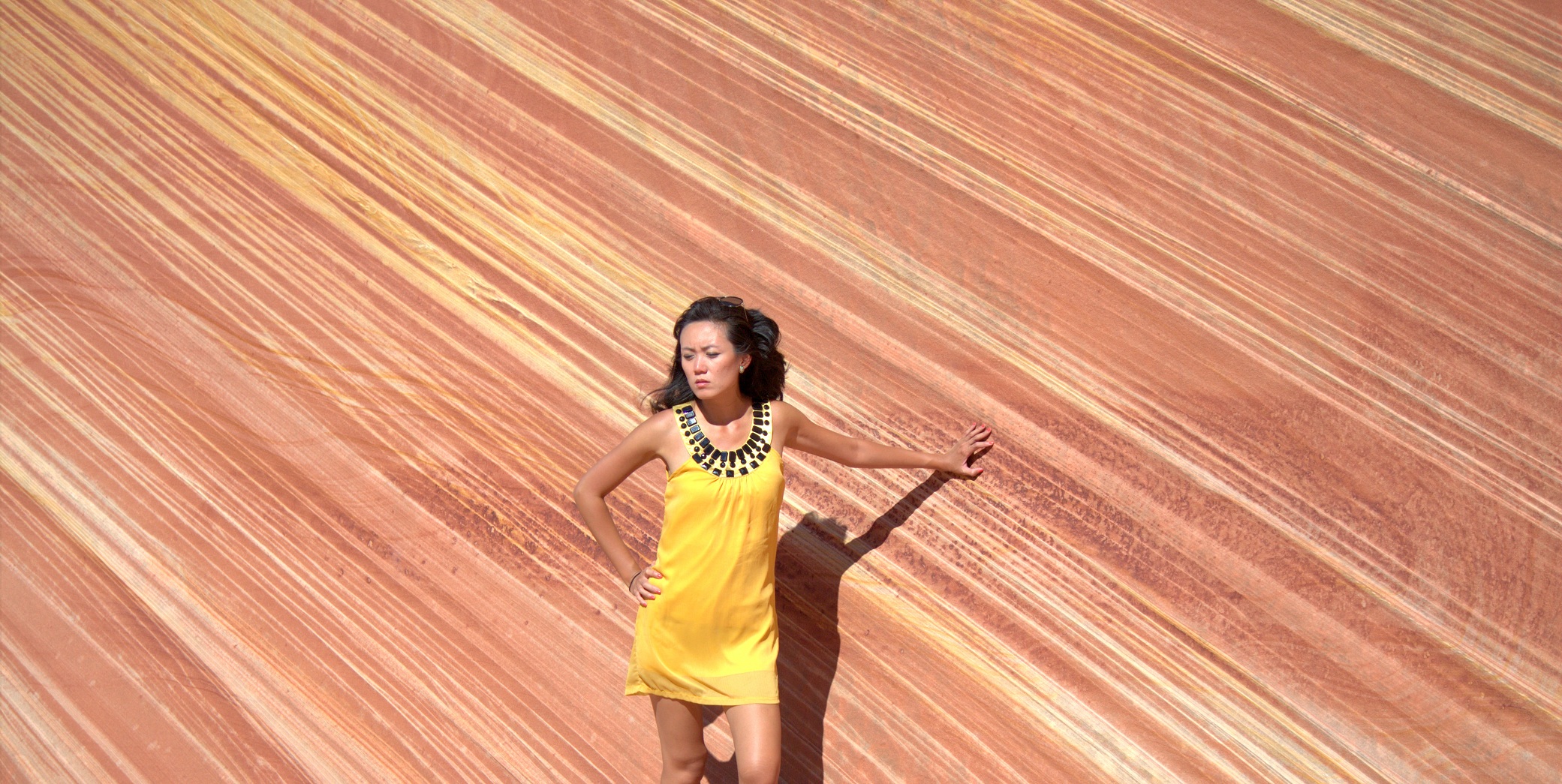 So, adventure seekers, never shy from glam. For where there is stubborn and jagged rock, there is succulent flesh and flowing fabric. Match the deathly valleys of hiking with the depth of imagination, the squint of a bullying sun with the glare of a zoom lens.