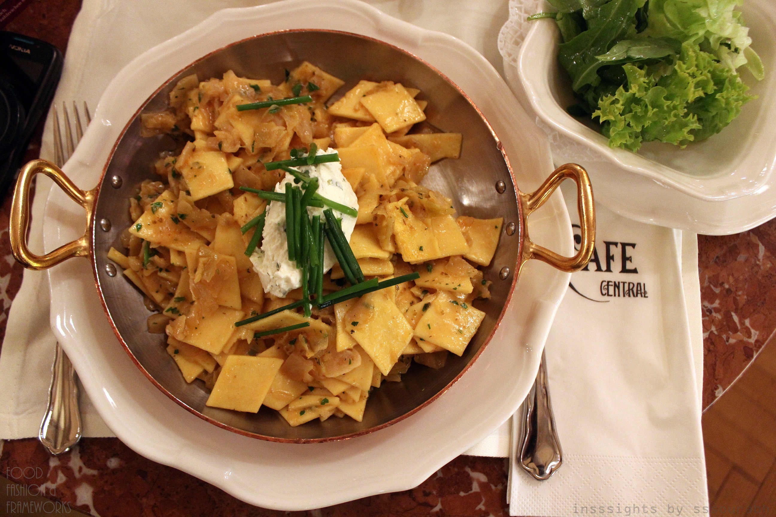 Feeling the need for starch and salt, I got the inventive sounding Viennese square noodles with white cabbage, chive cream and gnocchi, accompanied by a green salad. It arrived piping hot on a traditional copper pot with sizzling handles, topped with delectable chive cream and thyme. The square noodles were easier on the fork than their slithering counterparts, and tasted fresh, complimented by herbs and a densely creamy sauce. I had forgotten that food in the country always started with a pot of butter, and consequently found the dish immensely gratifying and painfully filling in just a few bites. But nonetheless, the saltiness and creamy texture, along with the medley of herbs and addictive potato gnocchi gratified my carb-deprived body of its most basic, silenced needs. And I was happy.