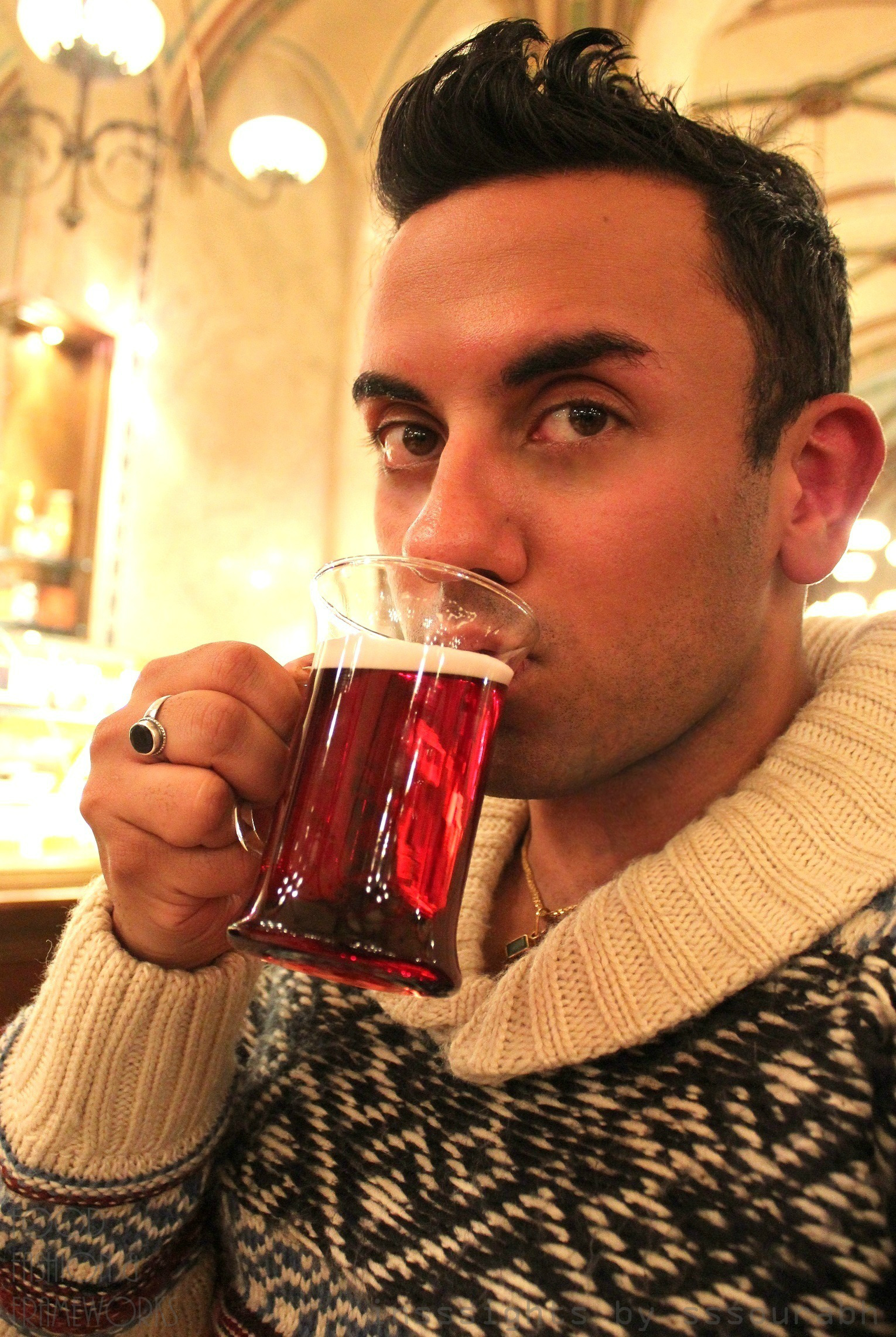 And then I began to gape at my opulent surrounding. High ceilings in cathedral-like curves and conical domes, with kitsch wrought iron chandeliers that cast a sepia glow on the humble surroundings. Thick velvety drapes over tall arched windows enabled transient moody seaters to peer outside at the tinsel town blinging with stars. Or perhaps reflections from the droplets of crystal water.
