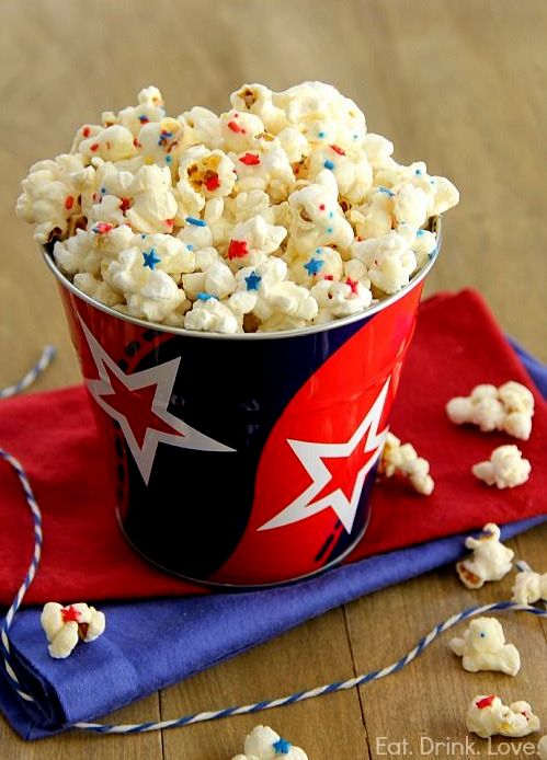 Its often eye catching when the spread of colors isn’t in proportion to the flag, but rather out of proportion. Like a dominantly red sweater with sprinkles. Or vanilla macaroons with a hint of red and blue. Or playful natural white popcorn with a speckle of stars. Simplicity is truly in vogue.