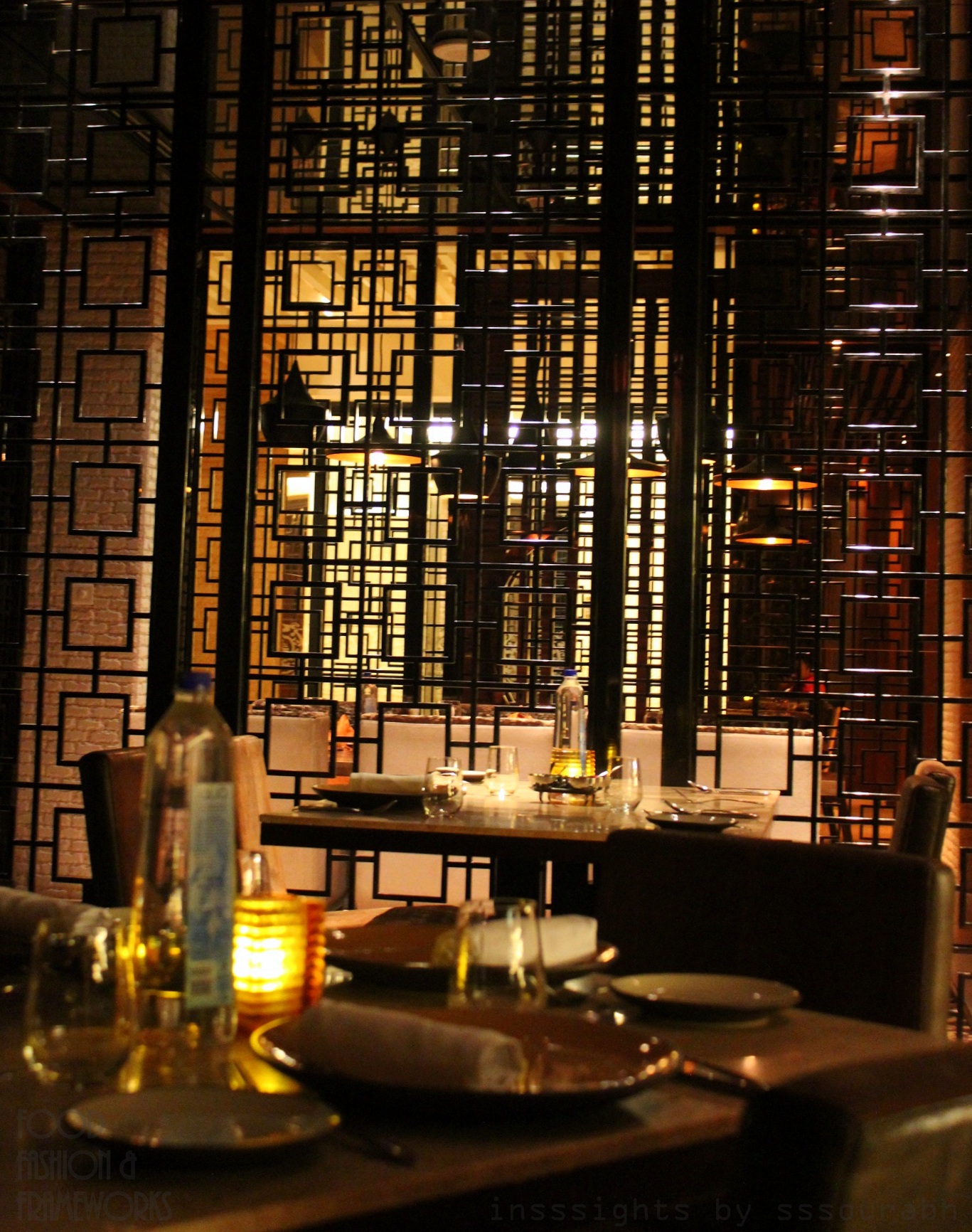 Multi textured decor and dim lit wooden structures lighting made for a cozy setting, yet layered with enough reflective mirrors and glass work to retain a luxury feel. Accents like brickwork walls untarnished with kitsch paintings, and traditional looking stone-wood-metal symmetry pattern doors reminded us of being in a contemporary Indian setting.