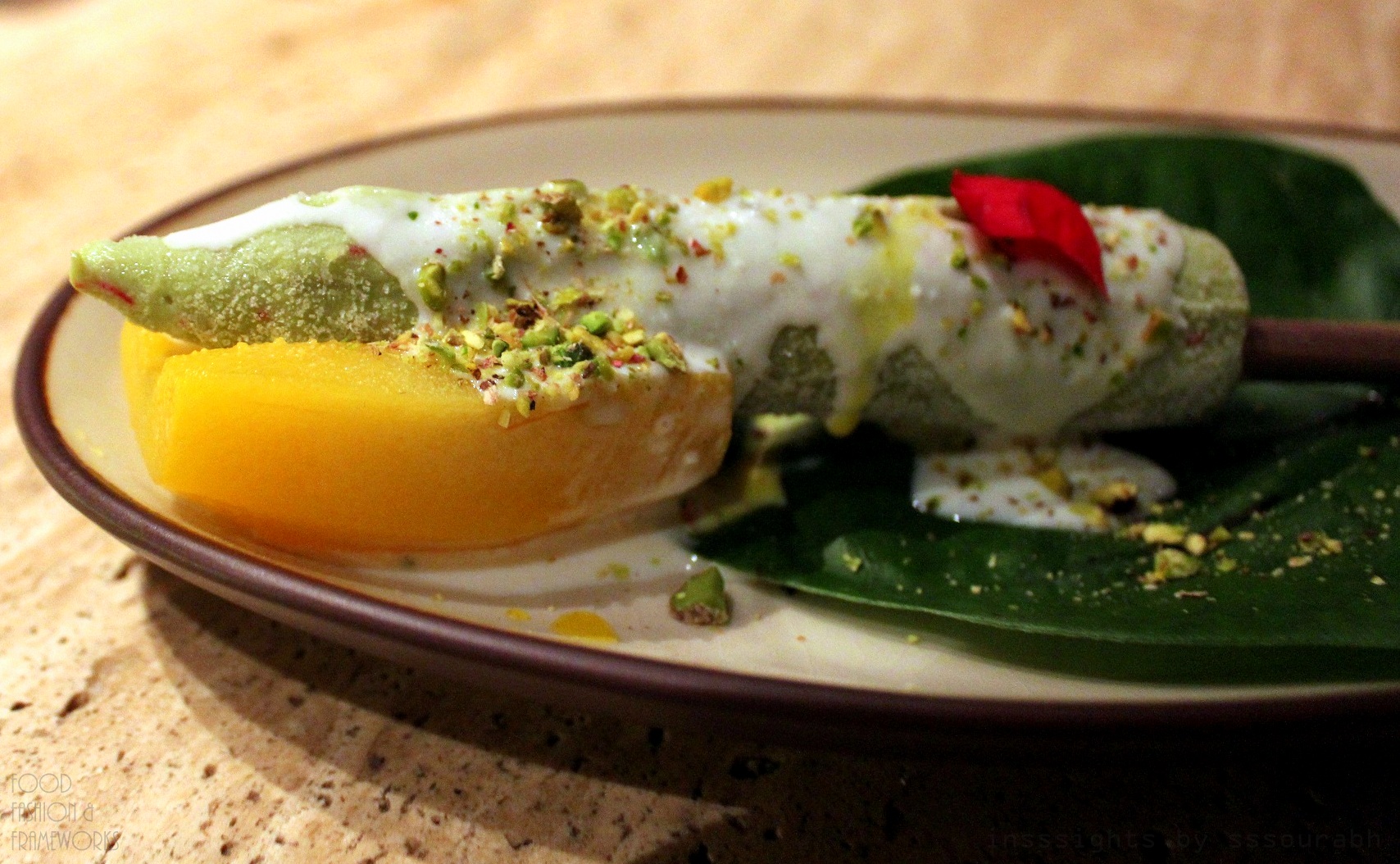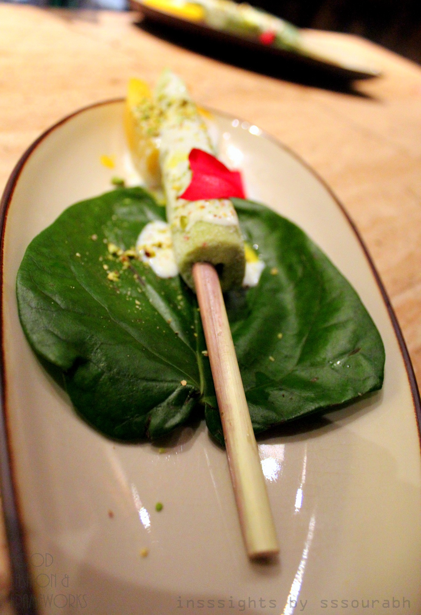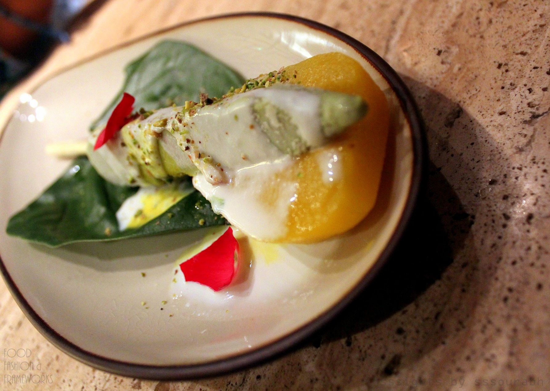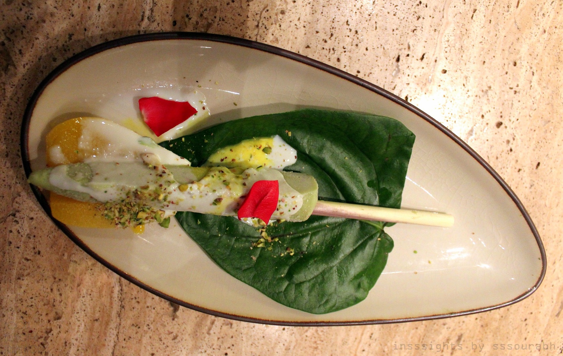 Moreover, what arrived was definitive eye candy – a raw betel leaf, perfectly emerald green, topped with a long, dainty kulfi on a stick, evoking nostalgic feelings from childhood. The green was a little too mild for a paan knockoff, and a little too much for a pistachio inspiration, but it was smothered with a sweet cream sprinkled with pistachio pieces. The tip rested lazily on a tart yellow peach, whose citrusy flavors were a welcome wisp of freshness next to the dairy overload. Sprinkling it with red edible florets, roses no less, completed the package as a colorful, luxurious and severely tasty marriage of kulfi and paan.