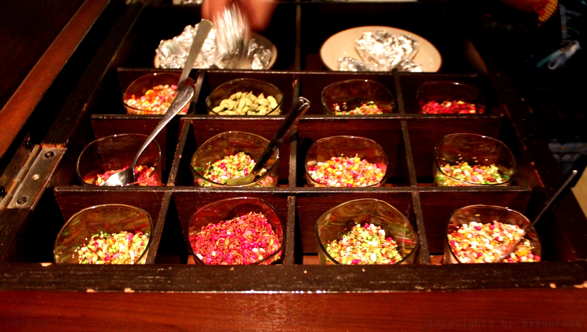 After slurping through the colorful palette of dessert, we ventured through the mahogany wood carved walkways to the intriguing Whiskey Bar within the hotel. But not before being whisked towards a treasure chest with crevices holding a variety of fennel, licorice and gourmet mixtures of saunf, a healing and indulgent digestive. And bejeweled in silver, completing the royalty theme and like a whimsical nod to our true loves, was a crevice filled with a plethora of paans. The hospitable staff did not mind as I gleefully lunged into the varieties.