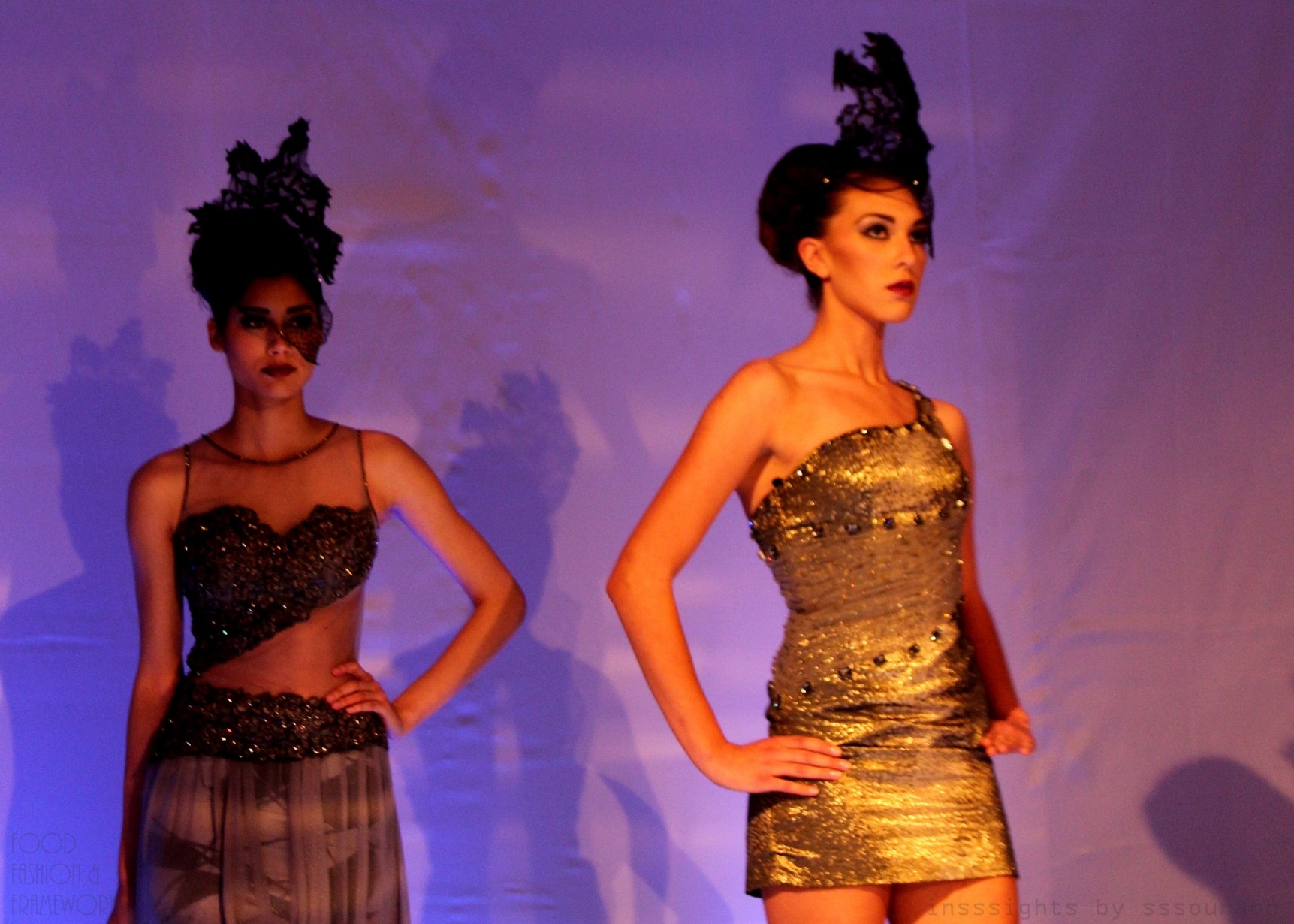 Sushma Patel’s ethereal collection also inched marginally away from the shades of grey, by introducing a blend of gold and silver fabrics and synchronized embellishments. The short fitted dresses spelled instant party, and were the icing on the cake, flirtatiously curving around the models’ bodices. While a gold wraparound style dress was encrusted with heavy duty dark jewels in an asymmetric pattern and luscious gold shoes, my favorite was a plain gold backless palette with sheer black accents and black pumps.
