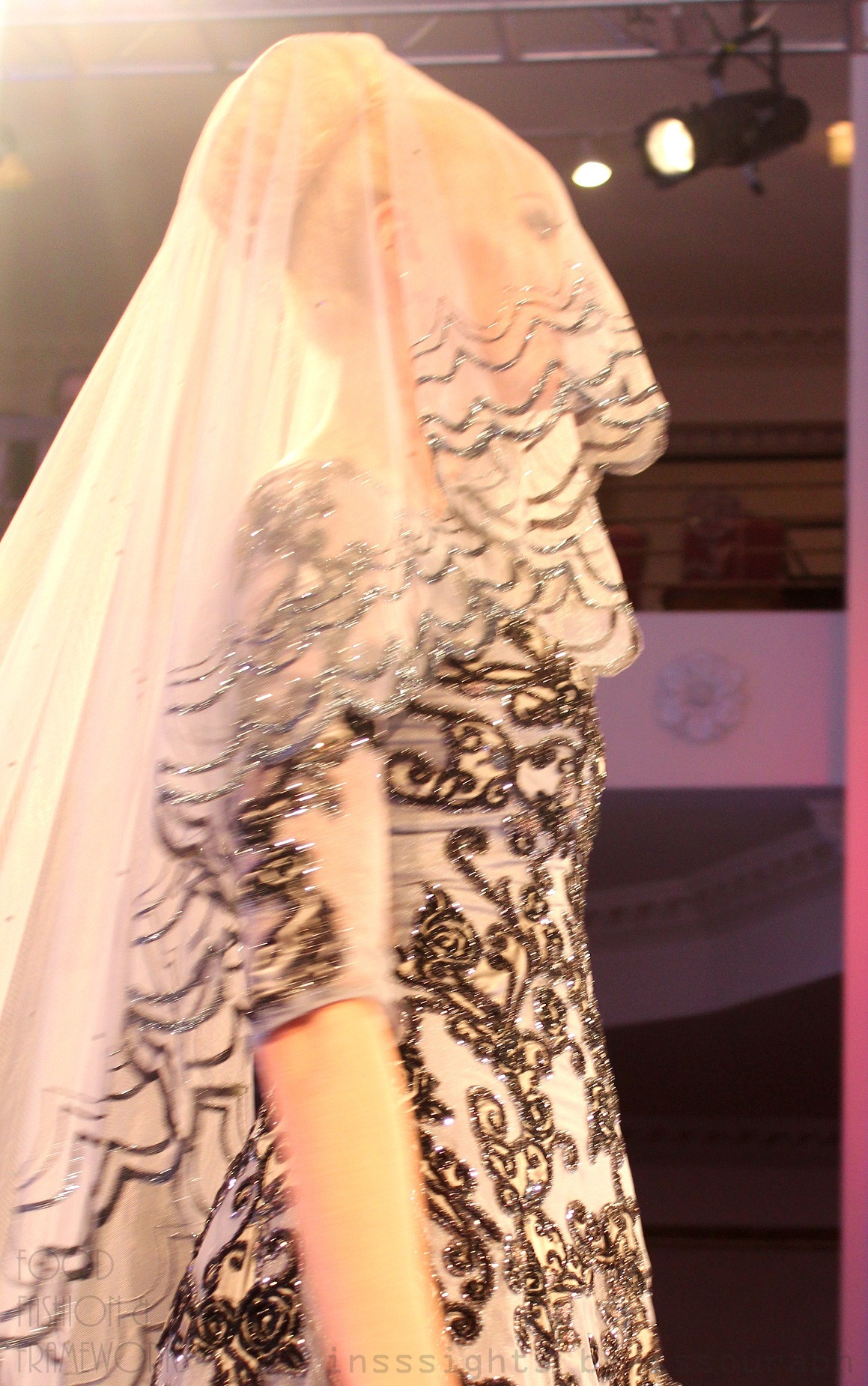 The showstopper was dressed in a Middle Eastern bride format, with a hue of grey that was a glamorous mix of edgy concrete, cloudy sky blue and country pigeon grey. Rose and velvet black motifs snaked around the bodice in vine format, giving way to a tissue and chiffon flare that swept the ground beneath the model’s grace. A veil with a country hooped edge added the right quotient of enigma and grace, making this a dramatic, elegant and striking piece.
