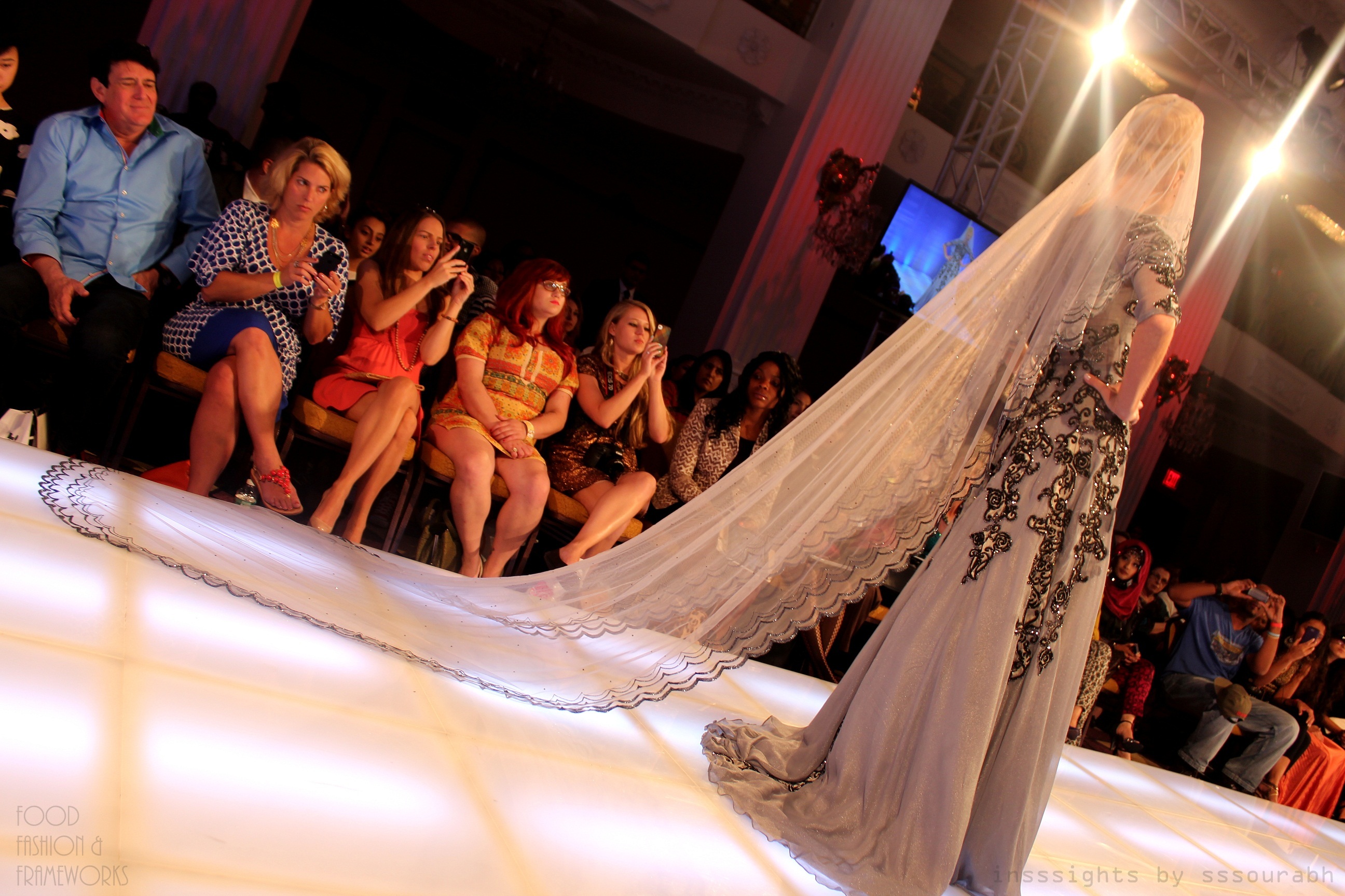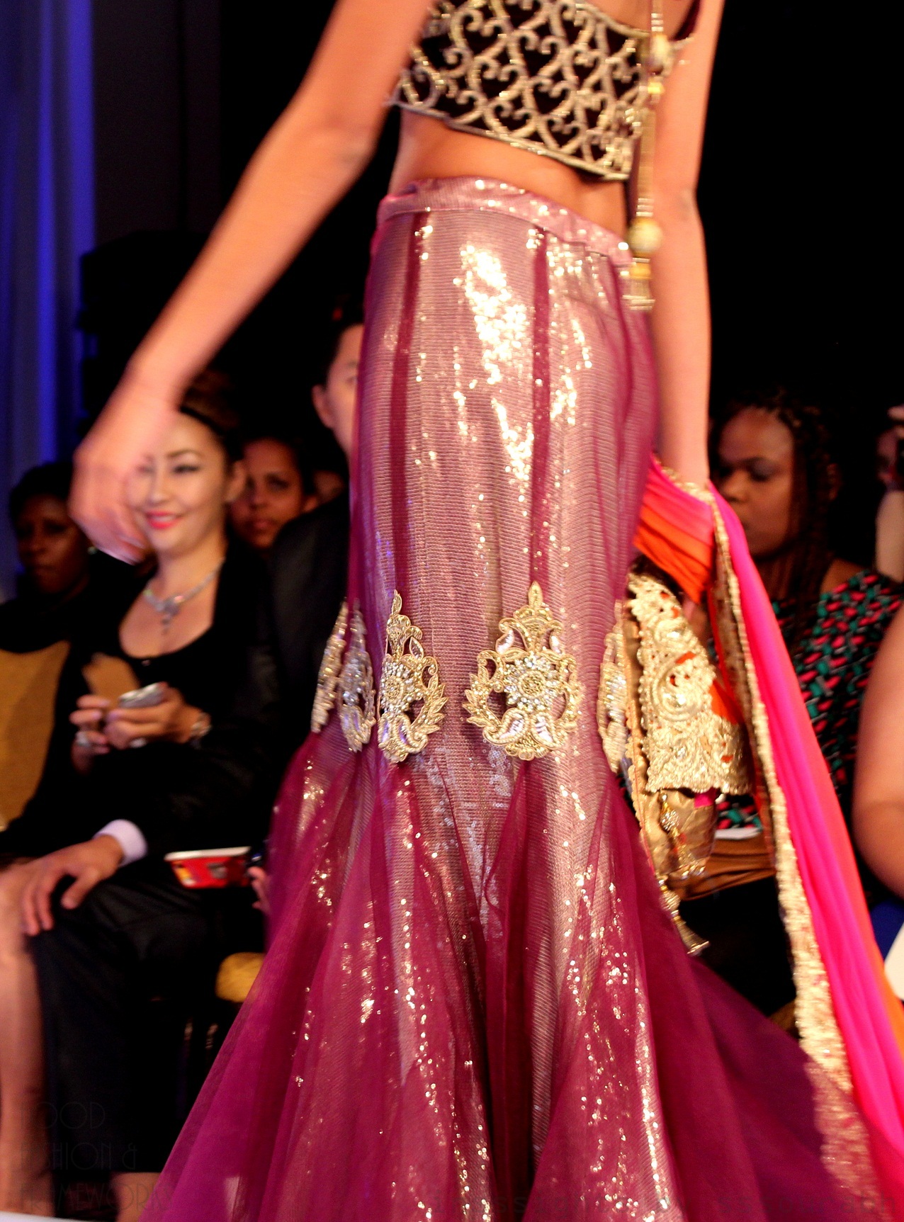 The more literal take on a contemporary Indian lehnga was rather jarring in its color combination, but decked with fine details. A royal purple and golden tank looked like it was padded with material so sturdy it looked solid, but form fitting nonetheless. It was paired with a shiny, dare-I-say-plasticy, sheer lilac lehnga woven together with North Indian gold motifs, alongside a pink and orange dupatta (that I think would make a perfect scarf to complement a formerly showcased black attire). A little overkill, but definitely jaw dropping and show stopping.