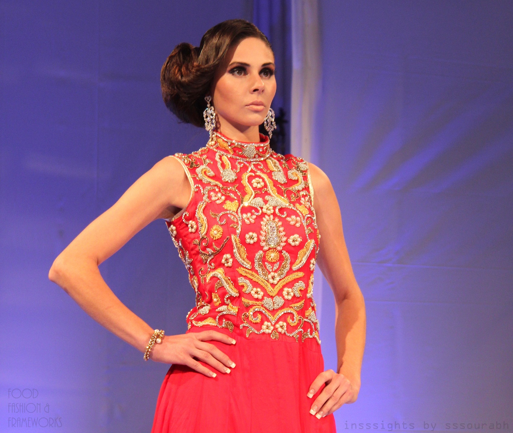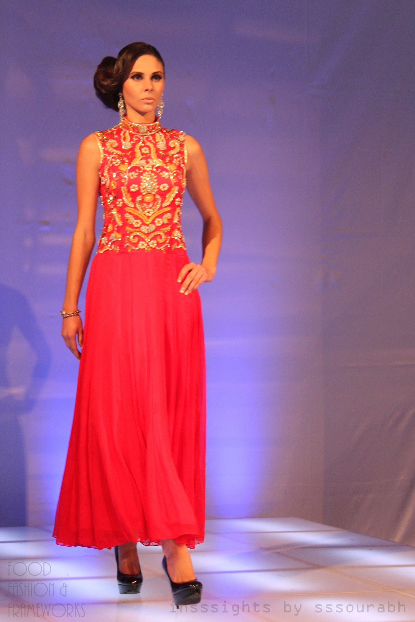 Priya Saluja’s opening act started with a lush coral (bordering on my favorite red) ankle length chiffon gown, embellished front and back with Northern Indian Punjabi bead work and sequins. A bit déjà vu but nonetheless refreshing when paired with chandelier earrings.