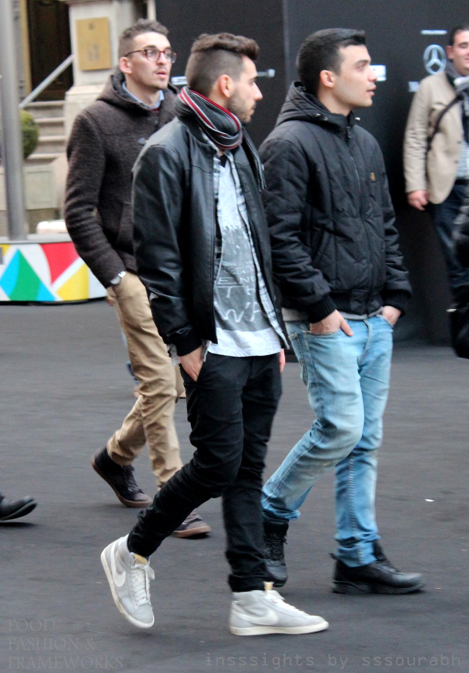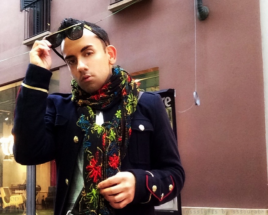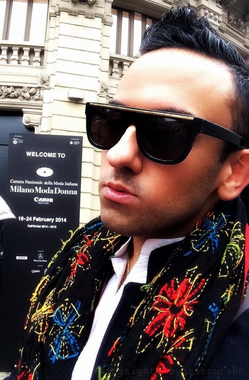 Combining what I liked of menswear trends from the other side of the Atlantic and my foray into the Indian fashion scene, I sported two distinct looks for my first stepping stones into Milan. A signature scarf trend – Spanish printed purple and mirrored Phulkari print, respectively – with my staple of addictive Super sunglasses, rather missing in Milan but oh so prevalent in New York, year round. Military or bomber jackets with asymmetrical buttons and zippers completed the look, flattered on one day with my leopard print high tops. Grazie, Milan.