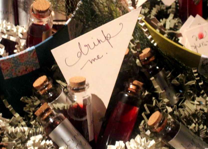 Amidst a series of fondant flowers and edible greenery, one of the iconic scenes of Alice’s world involves bottles that command drinking, making one shrink like a child (and later grow as an adult). Tiny vials by Stephen Collucci of Colicchio & Sons were filled berry flavored ciders and wines, corked with miniature corks to truly remind ourselves that even as adults, we could still be kids. And vice versa.