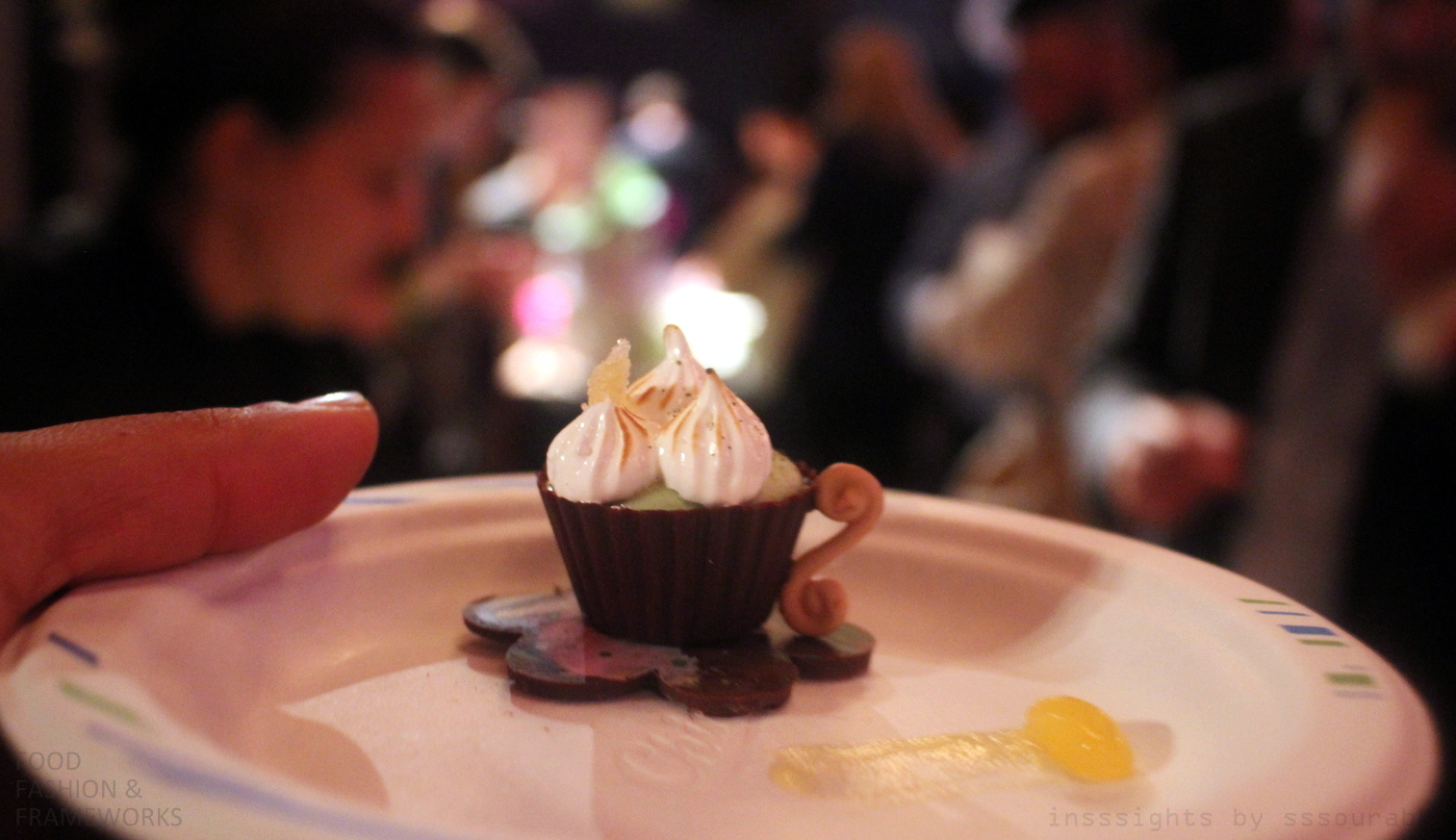 Accompanying these were tea-inspired and tea shaped pastries, each with a sugar cookie saucer, a solid chocolate cup filled with mousse or meringue and a garnish. While the green tea mousse with lemon meringue and fruity jelly was fresh, the gooseberry garnish reminded me of yet another fairytale with edible flowers. The tea itself plays a large role in Alice’s quest to grow up, as it does in mine, foretasted as an apt trend for the year. For Alice, it is a final promotion from the milky boozy days of youth into a more refined life, albeit made slightly mad.