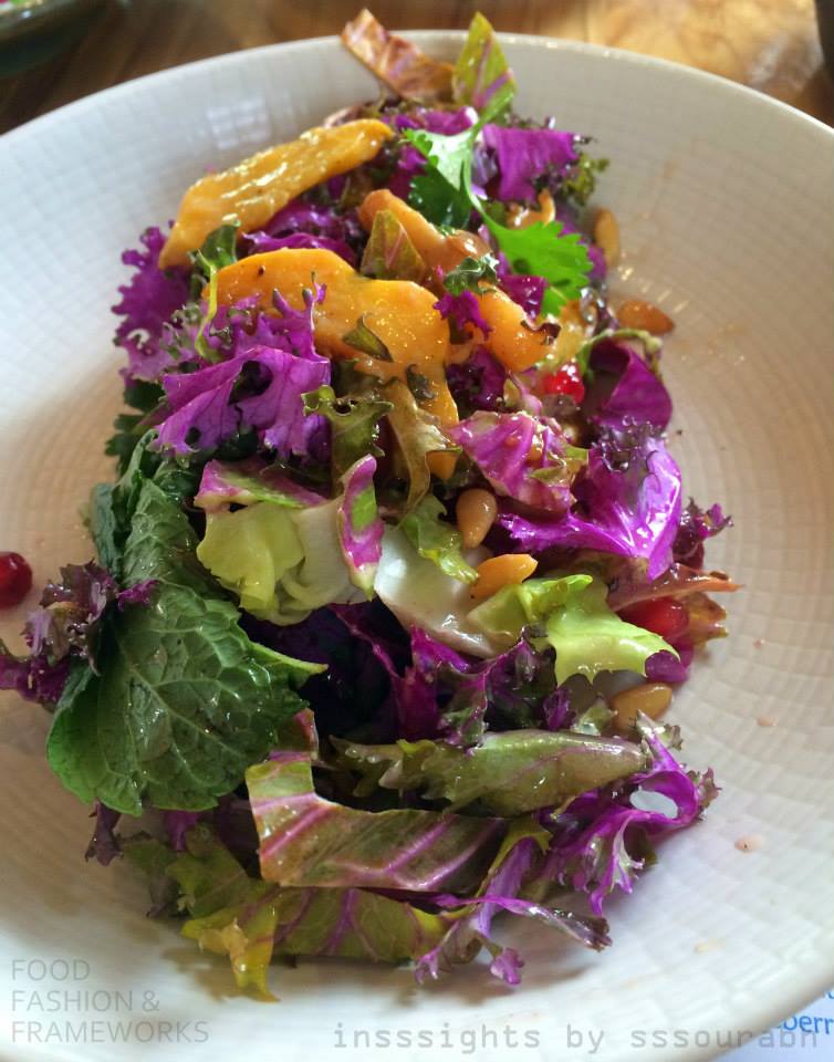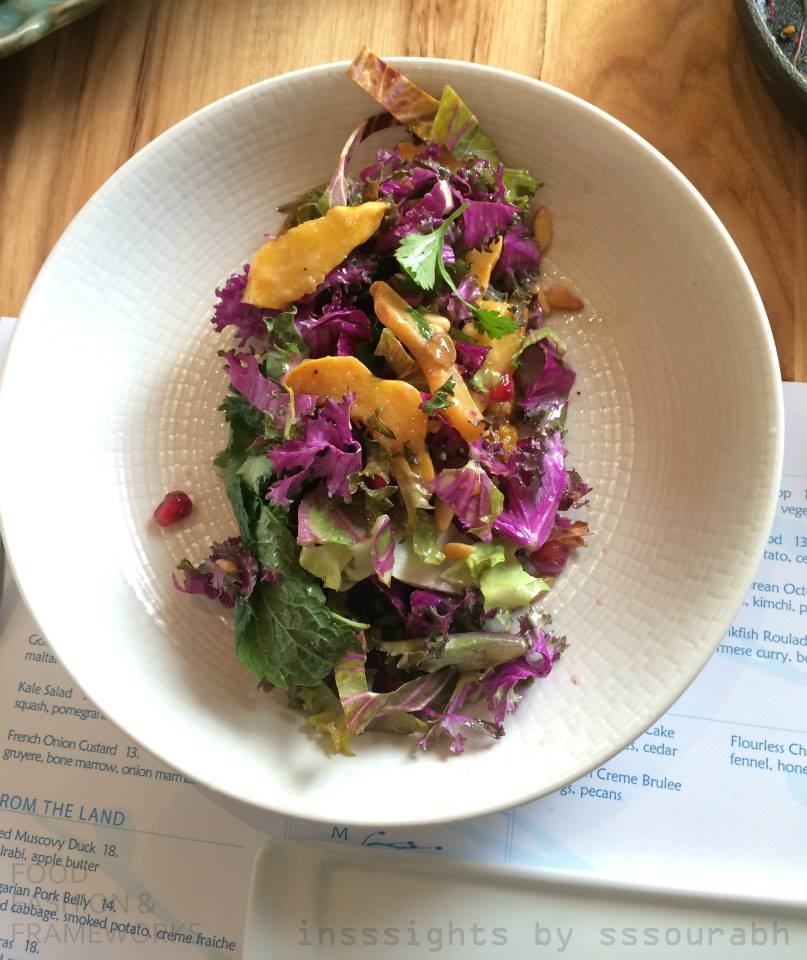 With my obsessive kale streak, the actual kale salad itself arrived in an artistic vertical on a round plate, dominated primarily by purple and yellow hues, both respective fashion color trends of the year. With squash, purple lettuce, pomegranate and pine nuts, it had a variety of crunchy textures varying from the tartness of the kale to the gumminess of the squash and the crackle of pomegranate arils. Definitely a clear winner in the healthy market category.