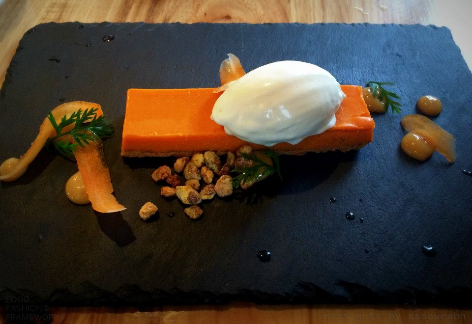 For dessert, I got my favorite carrot cake, identified here as a carrot cremeaux, hinting at its gastronomic deconstruction. For what I saw was a slab of carrot jelly on a gingerbread biscuit, outlined with pistachio and carrot shavings alongside raisins and a scoop of cream cheese frozen yoghurt. An intriguing concept this, for while I had had salad with sorbet dressing, I had never had the formats deconstructed to a point that juxtaposing them actually worked for the taste buds. The carrot tastes were the right balance of vegetable starchiness and sugar, and the ginger biscuit and frozen yoghurt gave a variety of spicy to healthy.