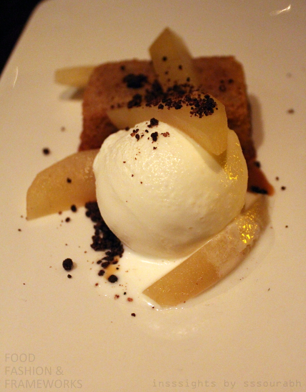 A whimsical dessert was the chocolate mousse cake, tiled like a long cuboid, over a swirl of sunny hued apricot jam, and embellished with strangely green hued basil meringue and candied hazelnuts. The sheer colors threw me off, like an upside down landscape with suns below earths below grassy hues. And then I realized, that the basil meringue was in fact an ode to absinthe. For plating alone, akin to architecture on a plate, this dessert took all the merits. The meringue definitely had a basil flavor, and if I tried to test my palette strictly enough, could sense an undertone of the divine potion itself. The cake was a notch too sweet, but well supplemented by the fibrous apricot taste and the crunch of my favorite type of nut.