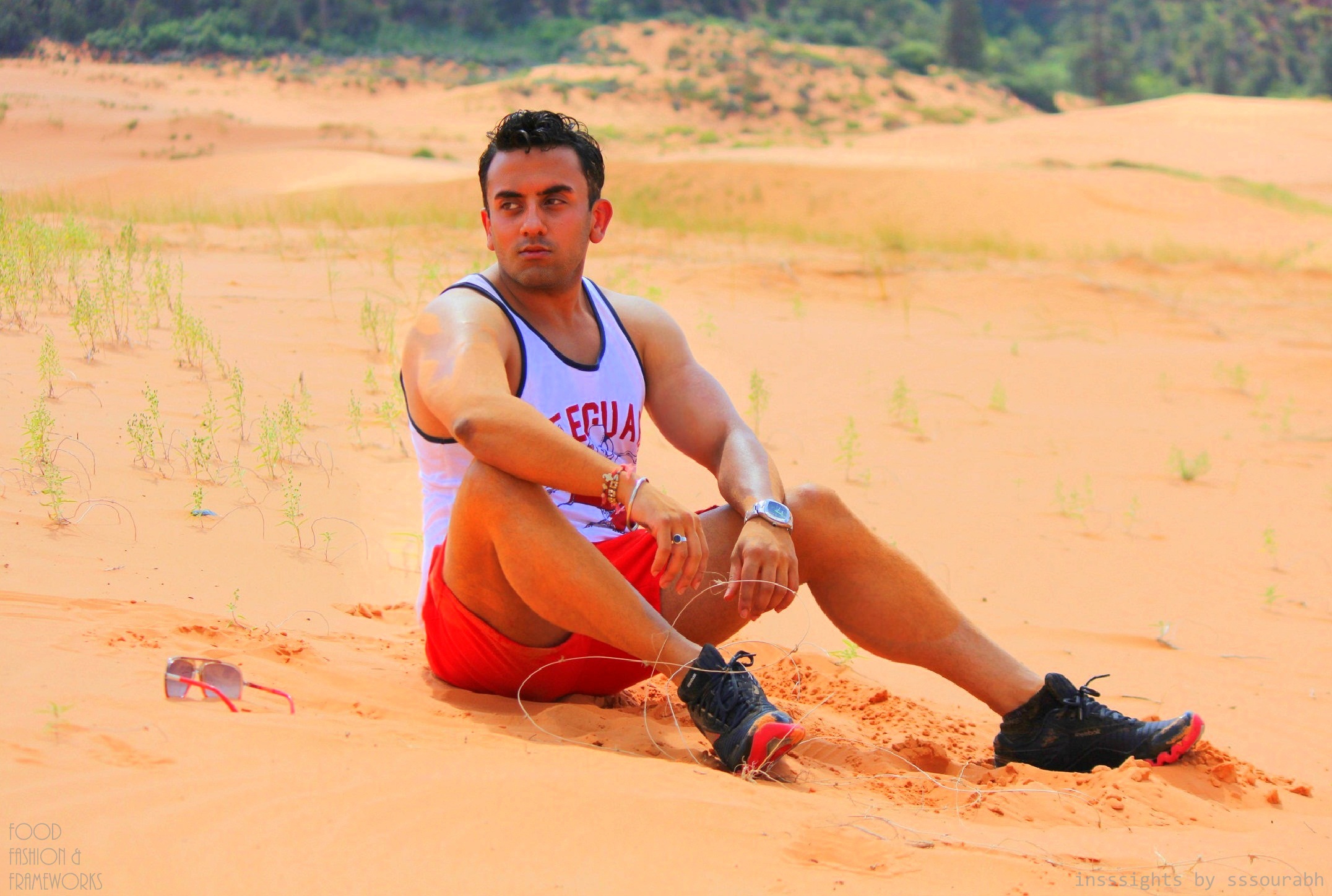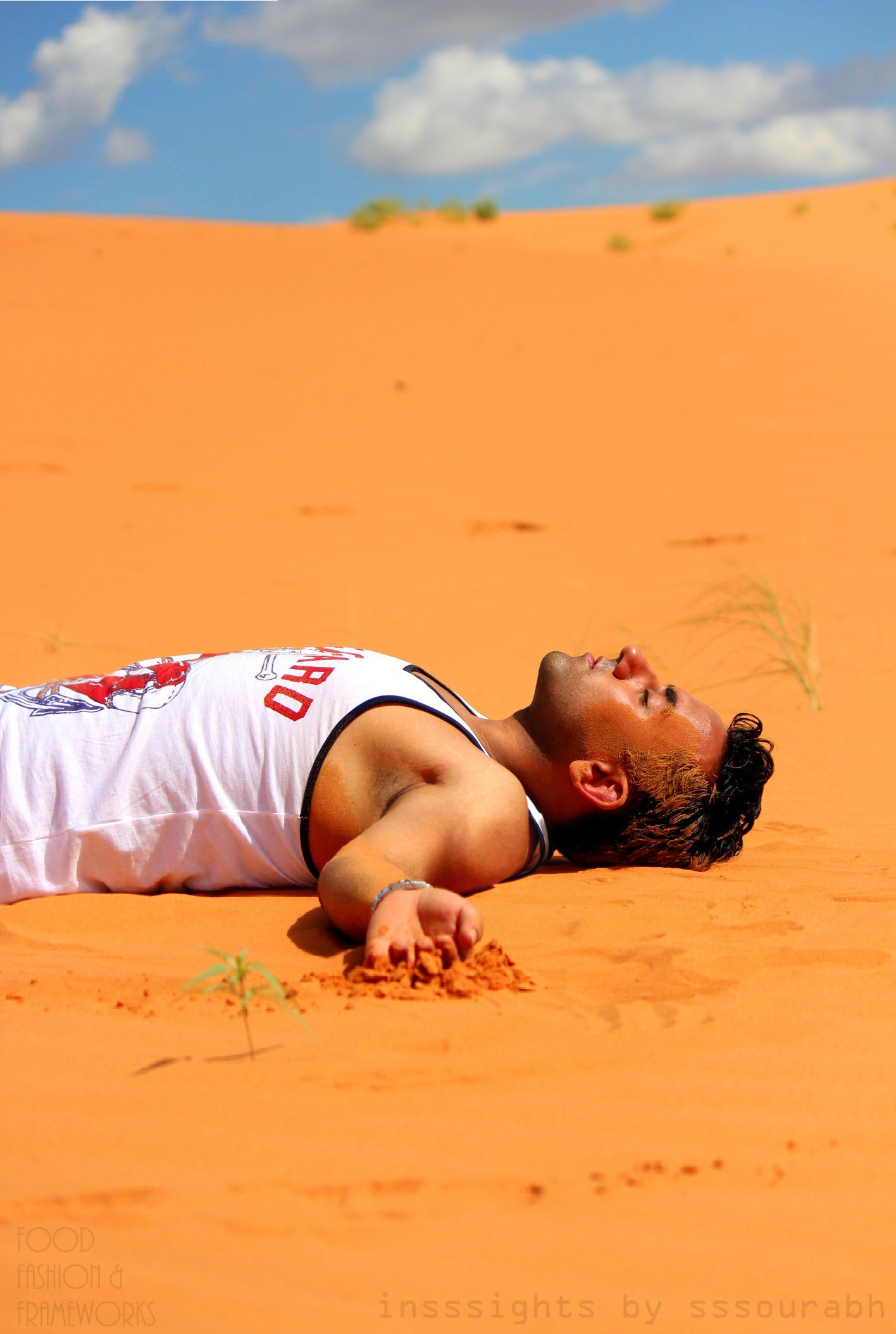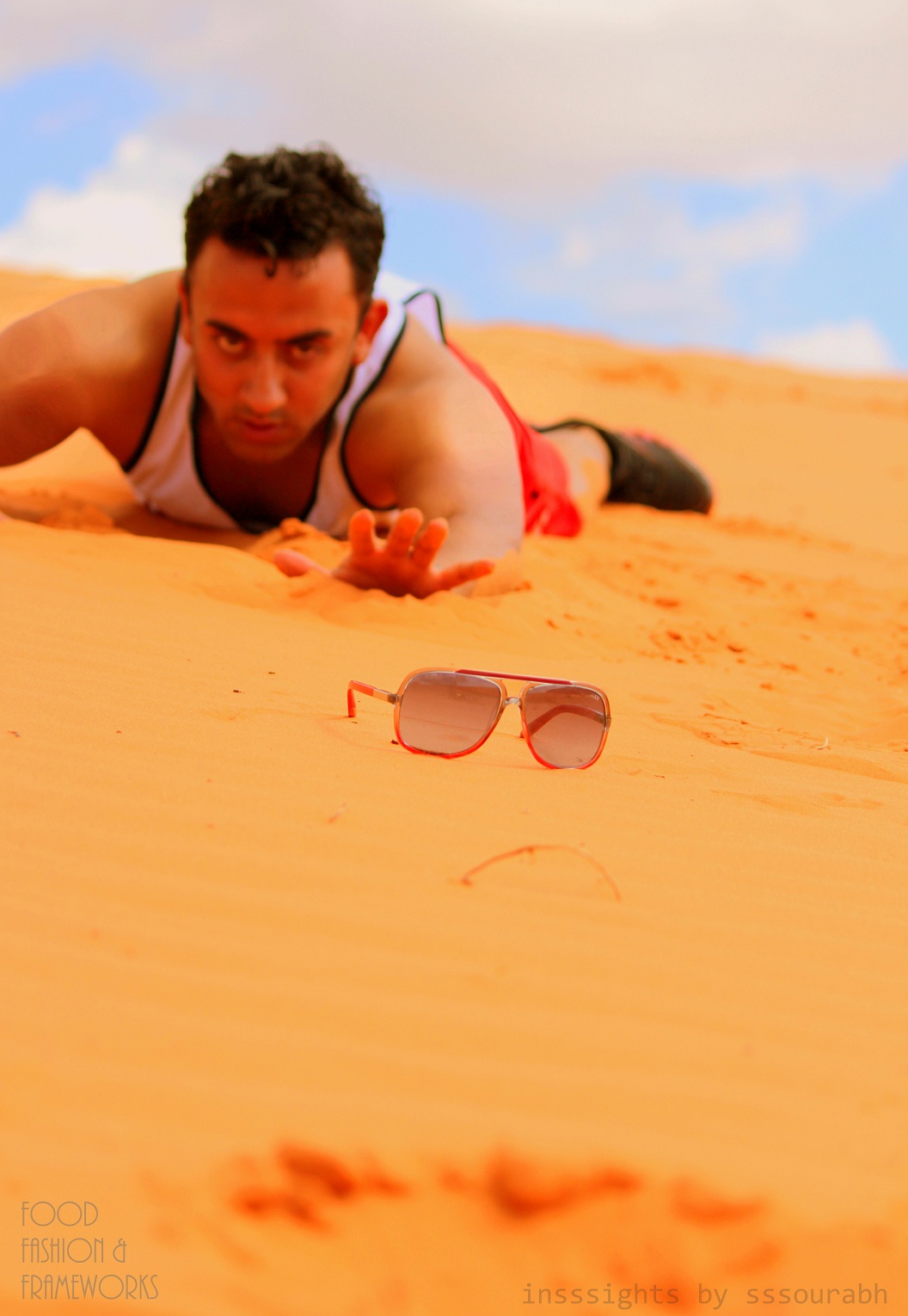 Kicking the sands, leaving footprints, leaving objects behind to personify death, evoking emotions of help and glee, diving headfirst into the sand, bathing faces in it, or reaching out to the angels of blue … we employed every strategy to deviate the attention from my lifeguard tank and bright red shorts, or her yellow Armstrong tank and petite hotpants. Which eventually began to blend well into the rustic desert ambiance of a lazy day.