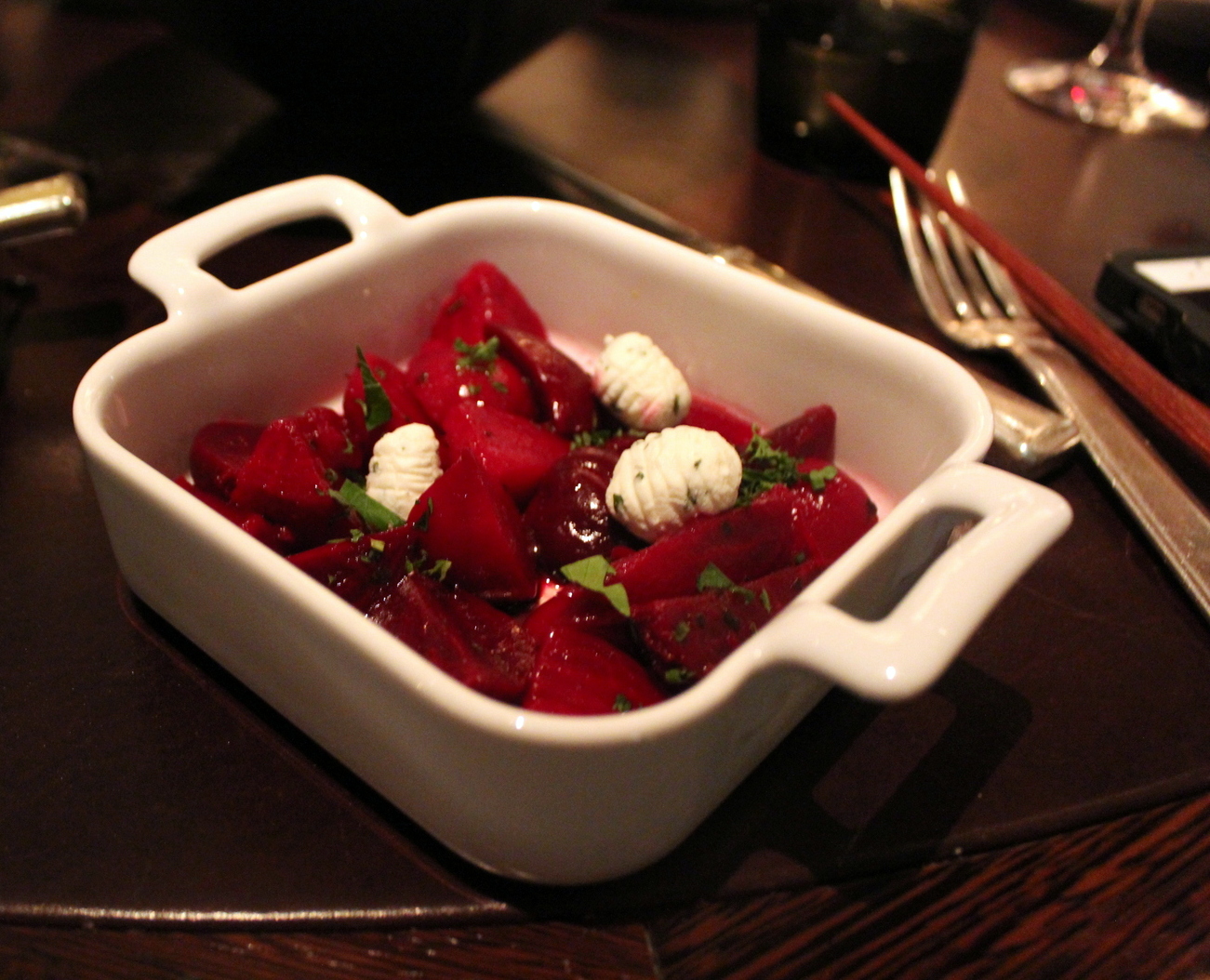 I personally stayed with superfoods, a staple on any modern menu. Marinated beets arrived scandalously deep pink, scented and glazed with olive oil and tarragon. So far so tangy and expected, but my favorite part of this plate was the goat cheese gnocchi, a phrase I would never have thought to utter in one sentence. My relationship with gnocchi is a faithful, committed one, and pasta-less shapes of potato and goat cheese were a dense, rich and expectedly salty morsel of flavor that lasted beyond its life in my mouth.