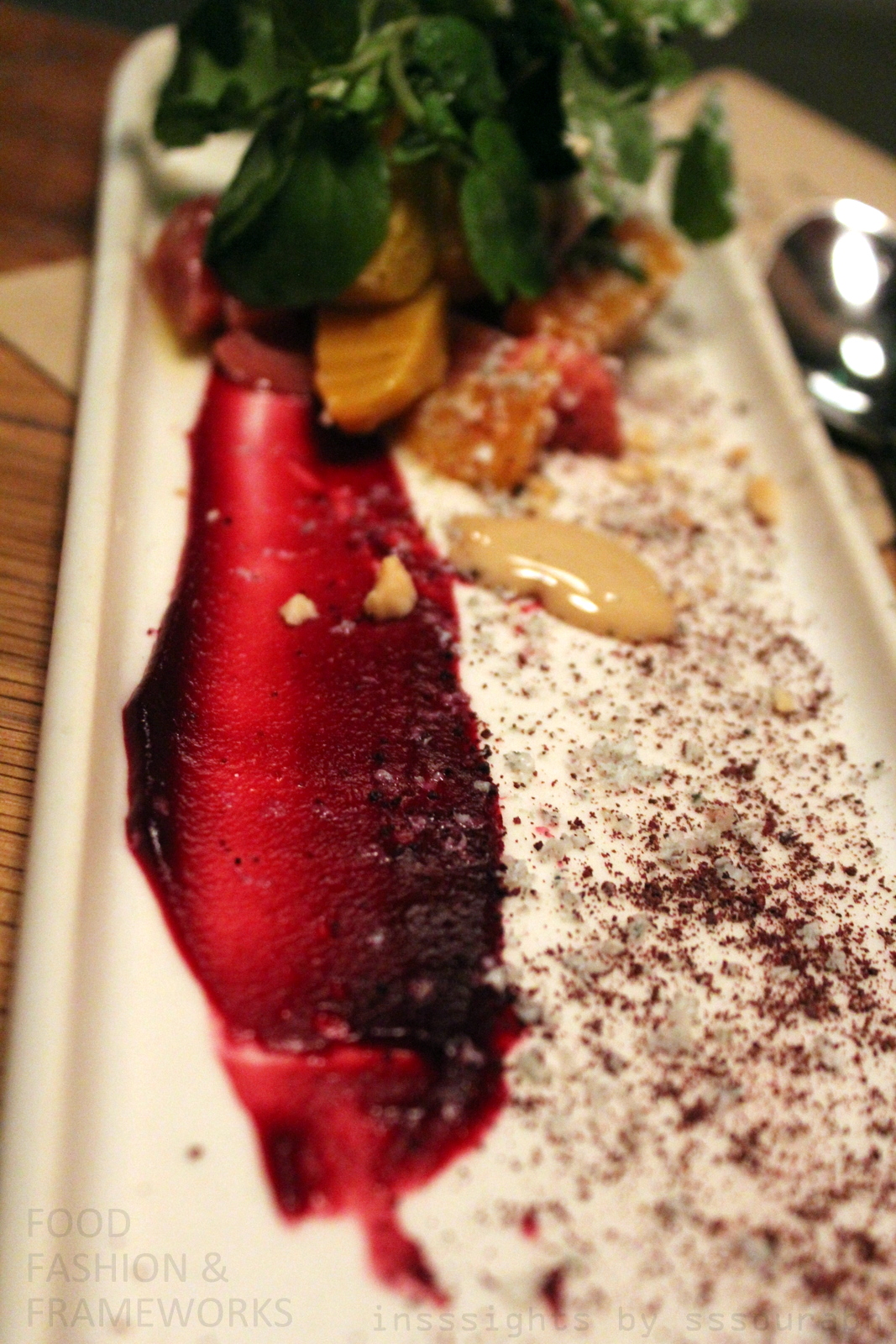 A radiant and disproportionately horizontal plate with a huge scarlet streak and cinnamon specks was just what an adulterous valentines evening was made of. Baby orange beets with Sausalito watercress formed the tasty, tangy crux of the plate, with a beet and tierra vinegar, sprinkled with the sweetness of cinnamon and the sharpness of cabrales blue cheese. An intriguing combo, almost like a blind date between a tough, old fashioned gentleman (the blue cheese) and a radiant damsel with more than succulent red up her sleeve (the beets). The result? Electrifying.