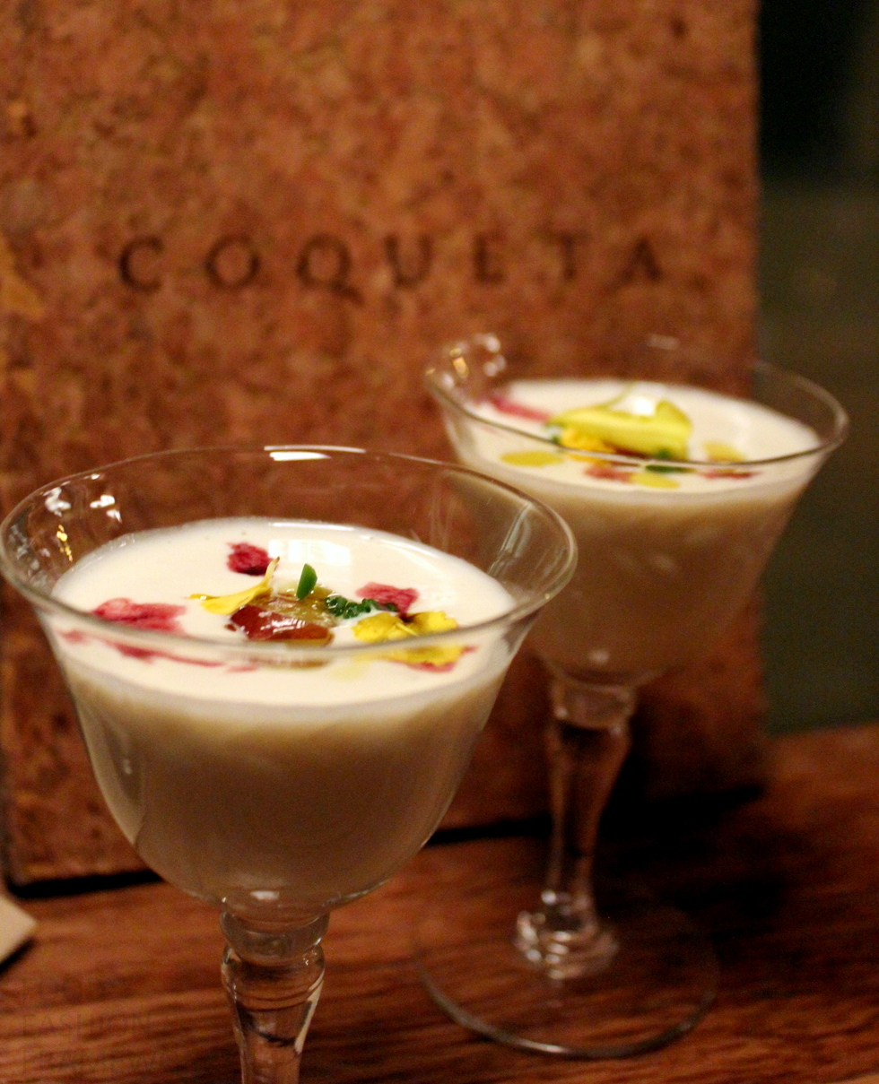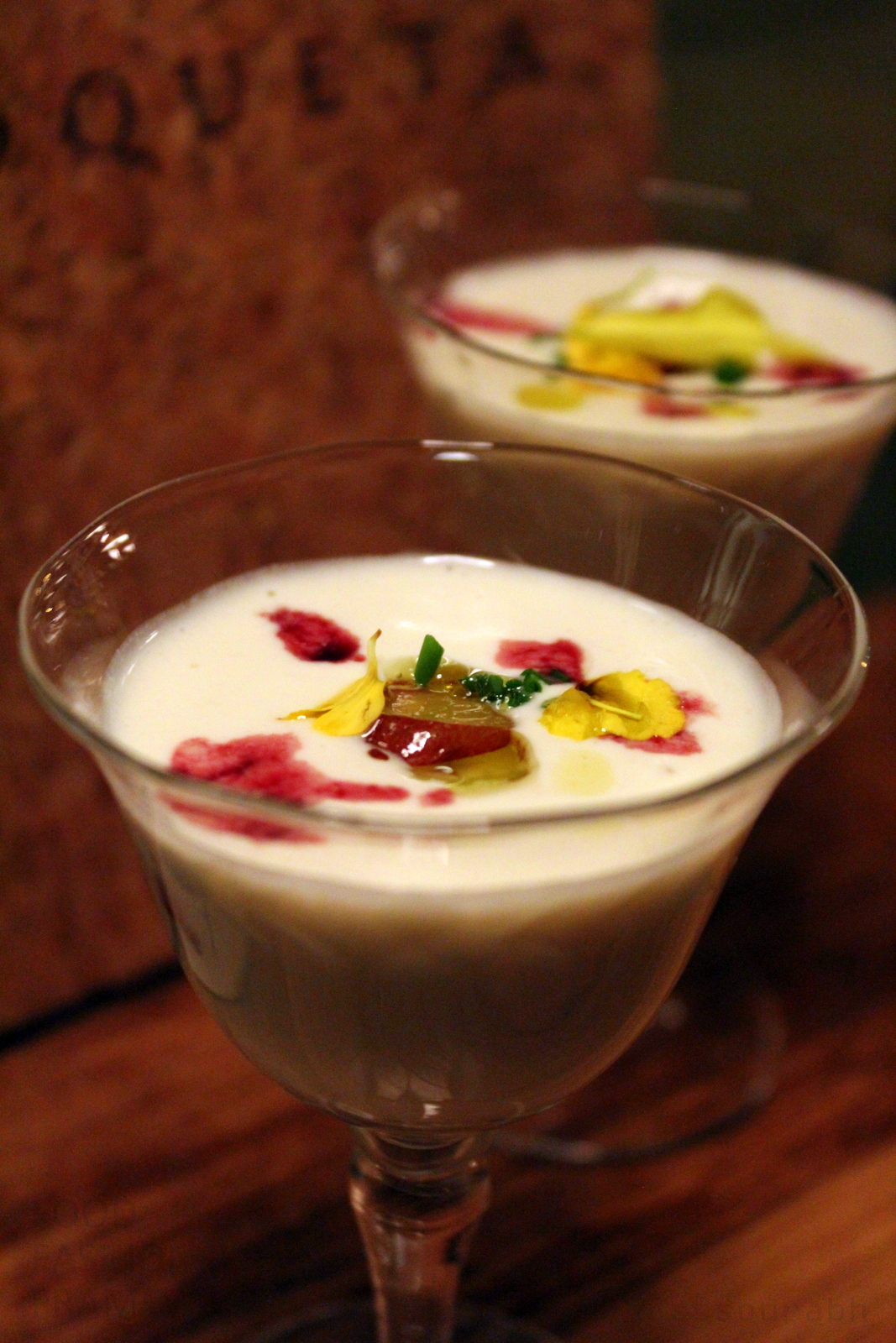Being very un-soup-like, I was surprised that we agreed on a Spanish classic, whisking me back to my days of Barcelona and Madrid: the gazpacho soup. A cold soup, usually with a tomato base, this one came in a cocktail glass and had a creamy white color to it, speckled with vegetable cuts and florets like jewels on a crest. It was almost as if the dish was playing with my mind, bewitching with a guise of being something exotic. And the best thing about such gestures is when the visual expectations are met with apt taste. The salty taste of marcona almonds was prevalent throughout cut by the sweetness of grapes, alongside syrah grapeseed oil.
