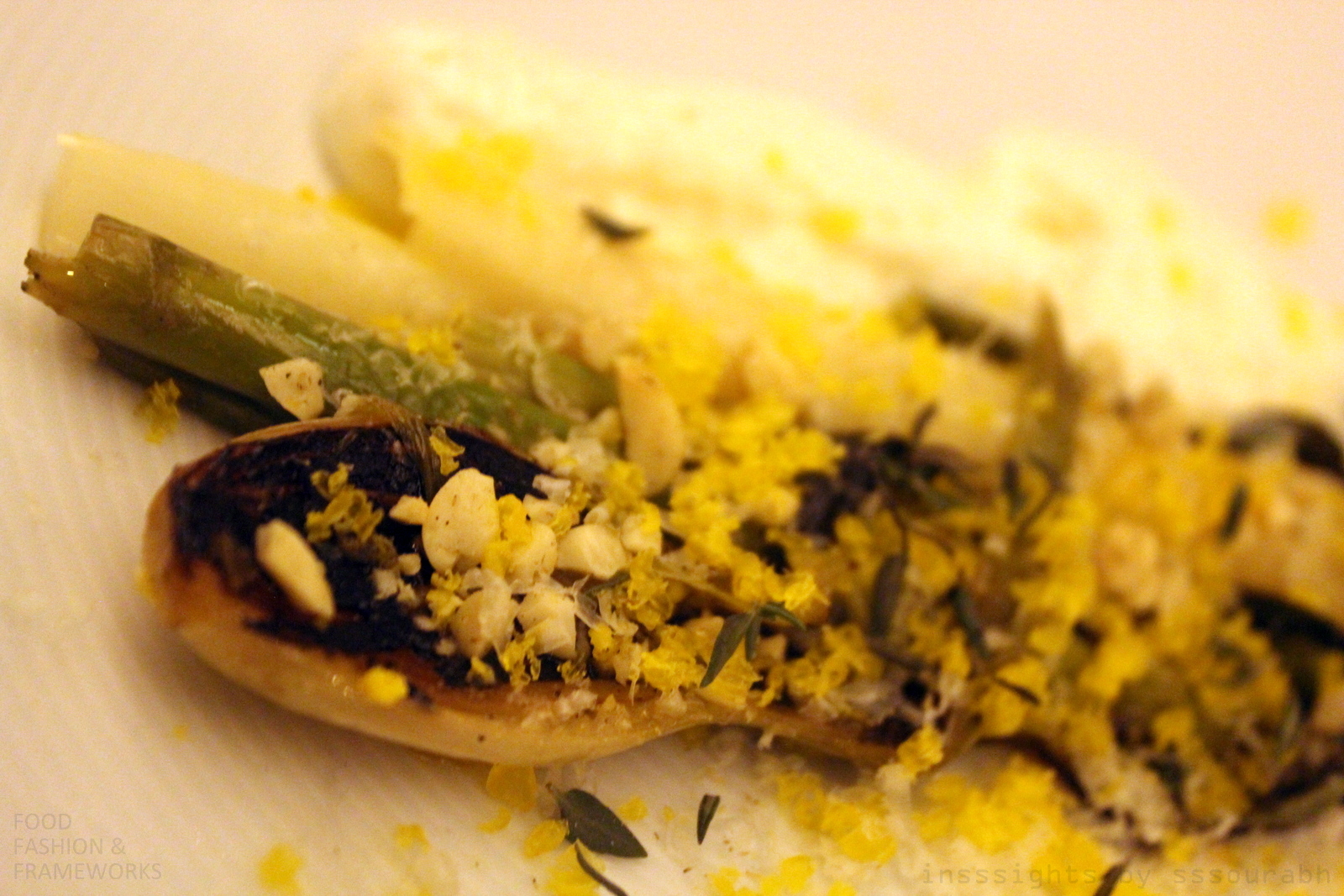 Third was a fibrous asparagus disguised in enough layers to redeem itself from a dieter’s must list, showcasing it like a fragile figment of an imagination. Covered with charred spring onion, it had dust and specks and balls of artistically dispersed yellow and white beads. They yellow was cured egg yolk which added density to the lean asparagus. The white bits were peanut pieces and hits of chamomile, almost suggestive in their arousing and sleep inducing prowesses. The collective taste was disparate from what one expects from asparagus, for this was a denser and flavor layered bite. And when I finally unearthed it, I found it to be flavorful white asparagus, which beckoned a cheeky pose before swallowing.